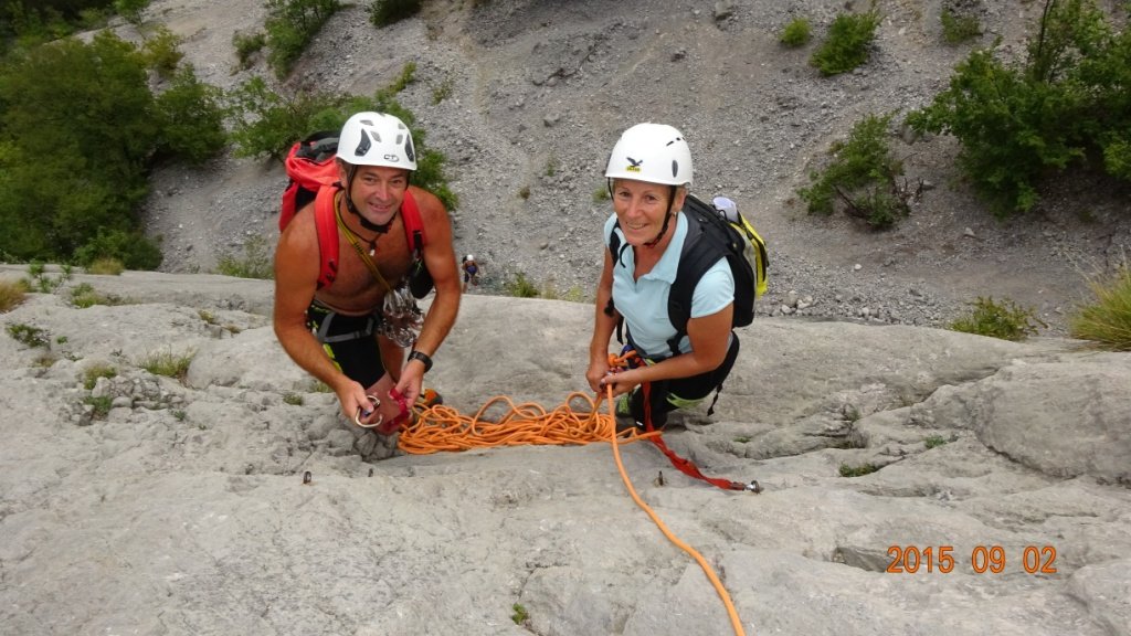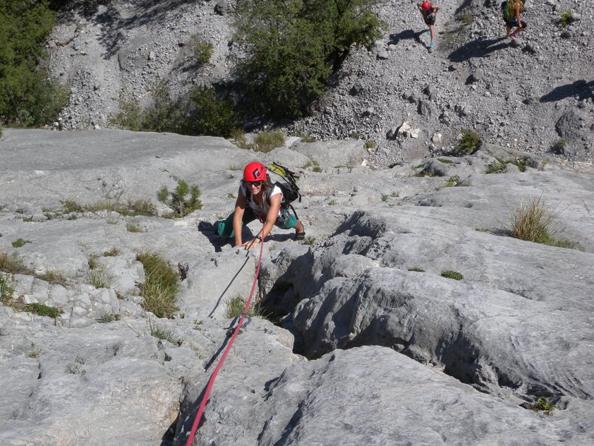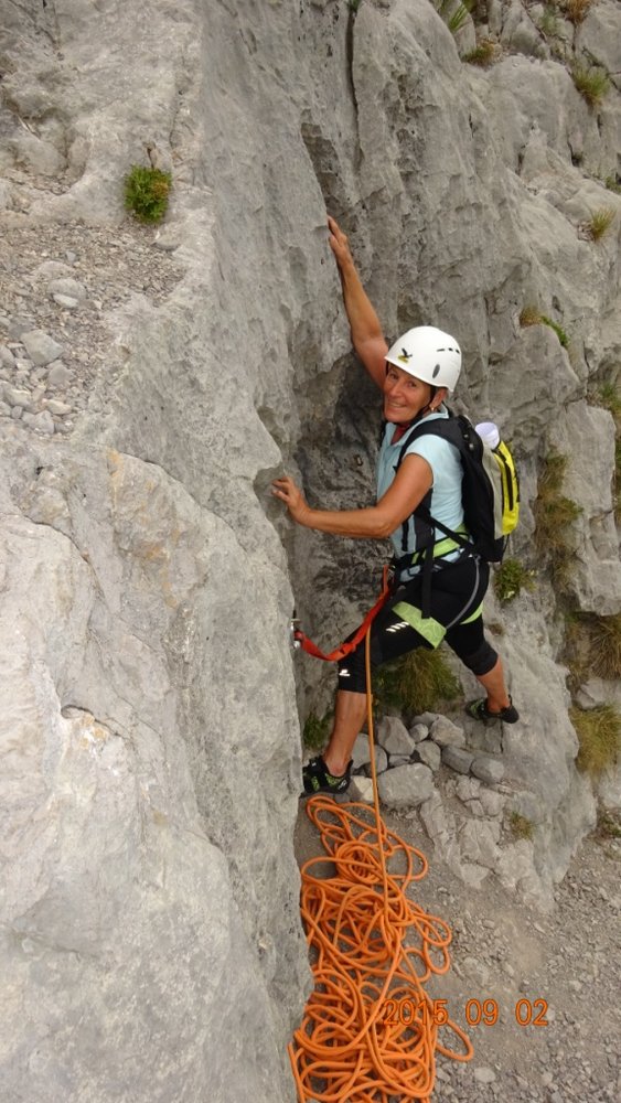 Die Via del 46 Parallelo ist eine der leichtesten und beliebtesten Kletterrouten an den Sonnenplatten (Plache Zebrate). Der Fels ist immer griffig und angenehm zu klettern, nur in der 3ten Seillänge wird es kurz etwas steiler. Kann man auch gut mit anderen Touren kombinieren. Die Parete Zebrata Platten gehören zu den bekanntesten Kletterzielen am Gardasee, man ist also selten allein in der großen Plattenwand.
