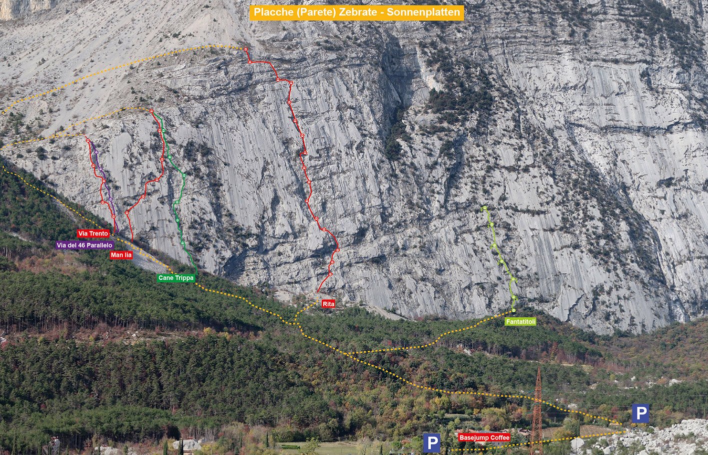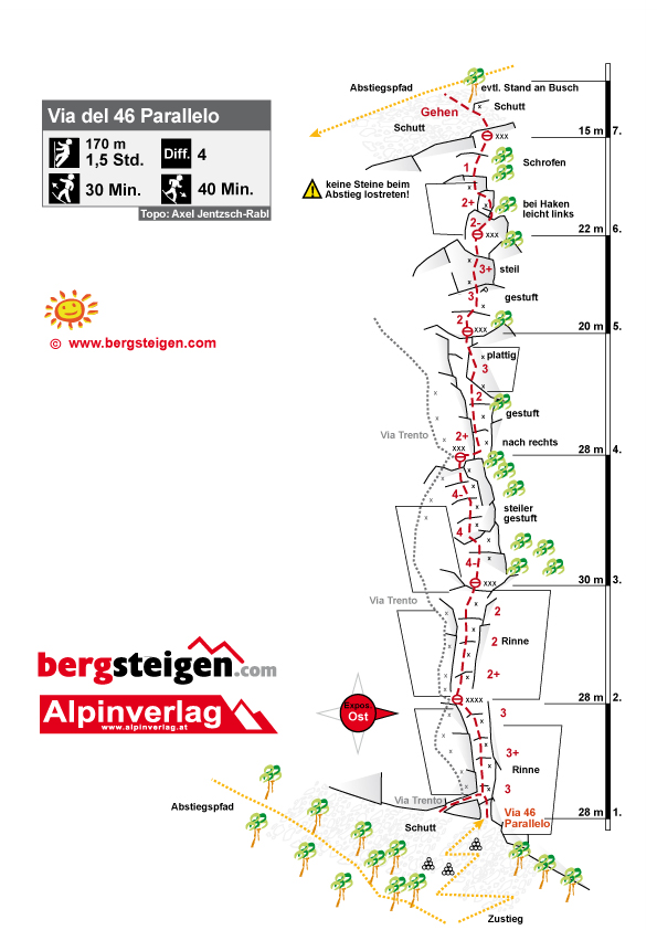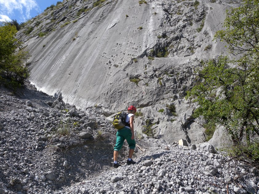 Vom Parkplatz auf dem guten Pfad zur Plattenwand. Man kreuzt einen Fahrweg, danach weiter in Richtung Plattenwand - aber schon links halten. Die Via del 46 Parallelo ist im ganz linken Teil der Platten. Am Einstieg geht der Schutt bis zu den Felsen. In Rot kann man Trento (Via Trento) lesen, etwas verblasst rechts daneben Via del 46 Parallelo.