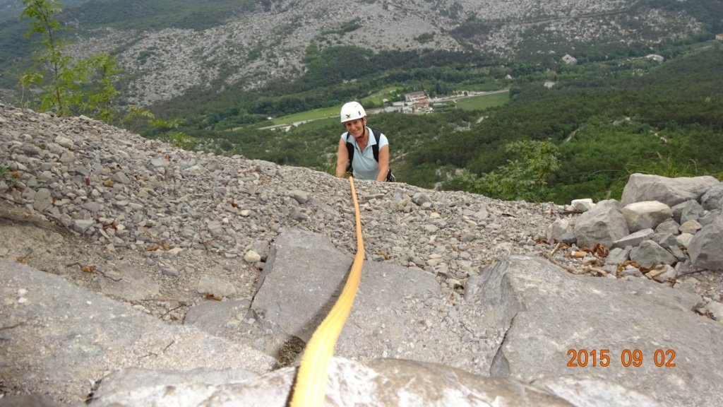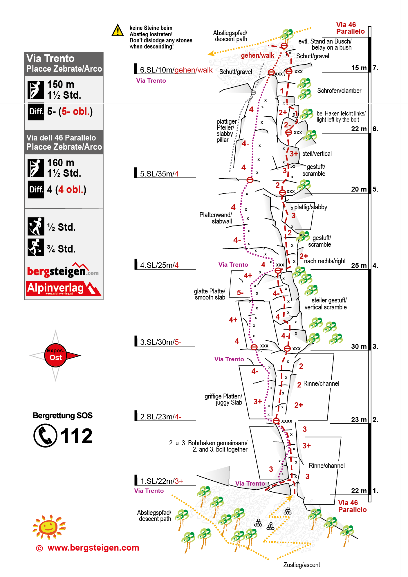Beim Abstieg nicht zu nah an die Wand gehen (Steinschlag) und beim Zustieg schon vor der Wand den Helm aufsetzen. Oberhalb der Wand ist eine große Schutthalde, auf dieser verläuft der Abstiegsweg. Im unteren Teil muss man etwas darauf achten, nicht links in die Via Trento zu kommen (die Bohrhaken stecken oft sehr nahe) - siehe Topo. Tipp: Keine Wertsachen im PKW lassen, auf dem Parkplatz werden recht oft Autos geknackt.