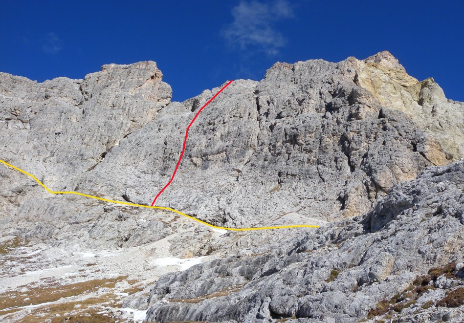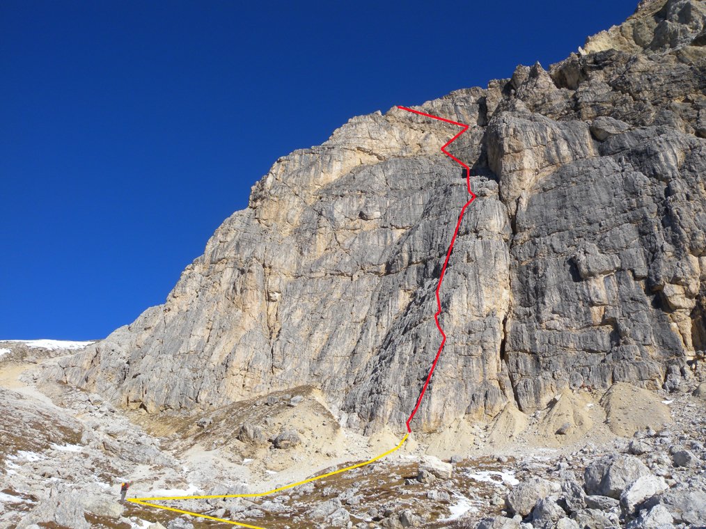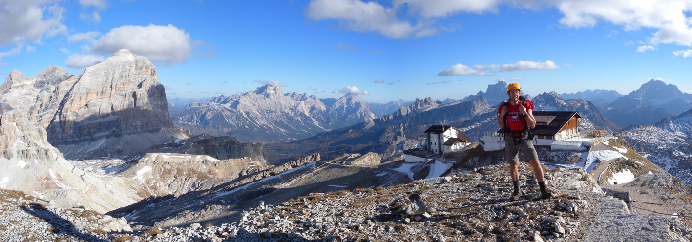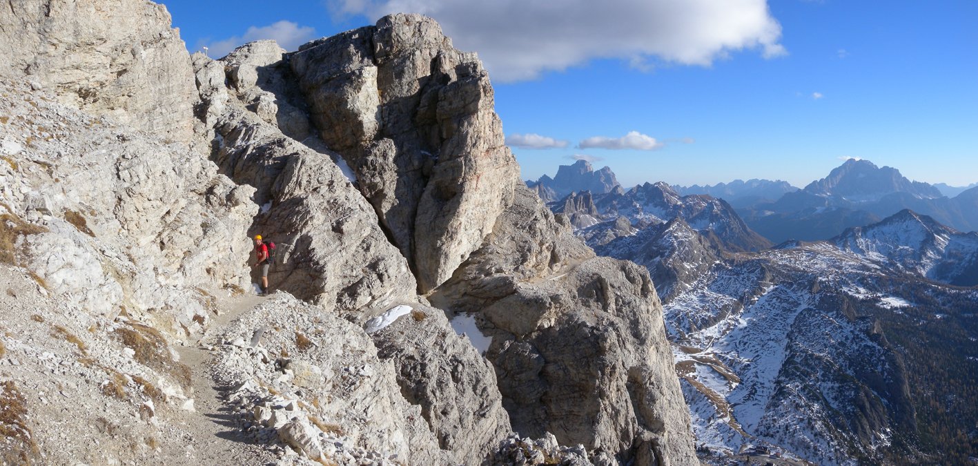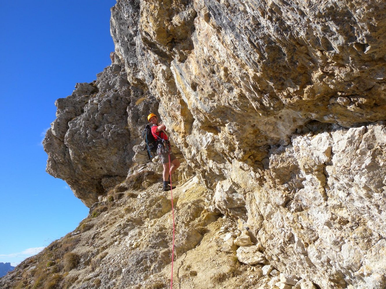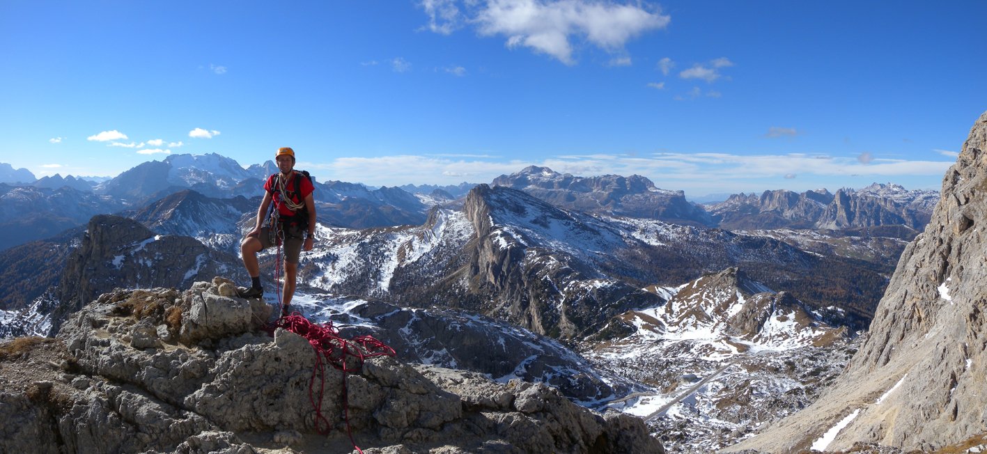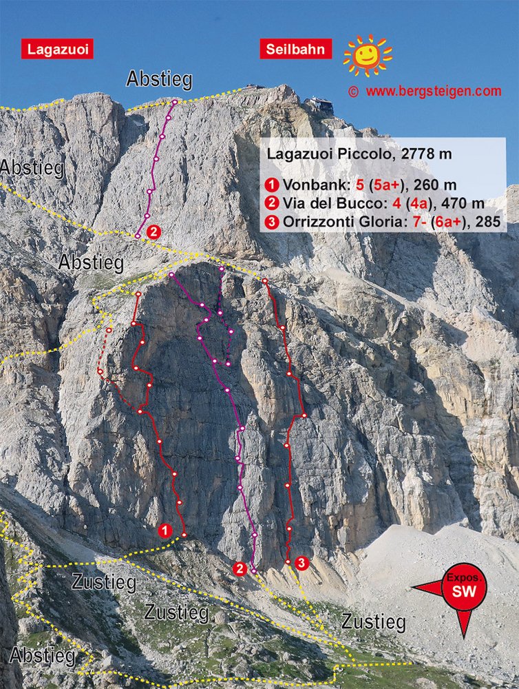 Lohnende und wegen der niedrigen Schwierigkeit sehr beliebte Kletterei am Falzaregopass. Die Tour verläuft im unteren Teil meist über sehr guten Fels, für den oberen Teil brauchst man wegen des nicht ganz so festen Gesteins etwas mehr Erfahrung. Macht man beide Teile gemeinsam, kommt eine recht stattliche Mehrseillängentour heraus, wo man im Nahbereich des Gipfels aussteigt. Von oben hat man einen fantastischen Ausblick auf die Fanesgruppe, den Sellastock und die weißen Gletscherhänge der Marmolada. Eine Top-Dolomitentour mit kurzem Zustieg. Tipp: Wer eine Stirnlampe mitnimmt, kann beim Abstieg noch die Galleria del Lagazuoi (Kriegsstollen) begehen. Der ganze Lagazuoi ist mehr oder weniger ausgehöhlt (Infos an der Talstation, der Stolleneinstieg ist bei der Bergstation). Die Tour wurde in mehreren Varianten erstbegegangen. Wir beschreiben hier die leichteste Möglichkeit die Wand zu durchsteigen.