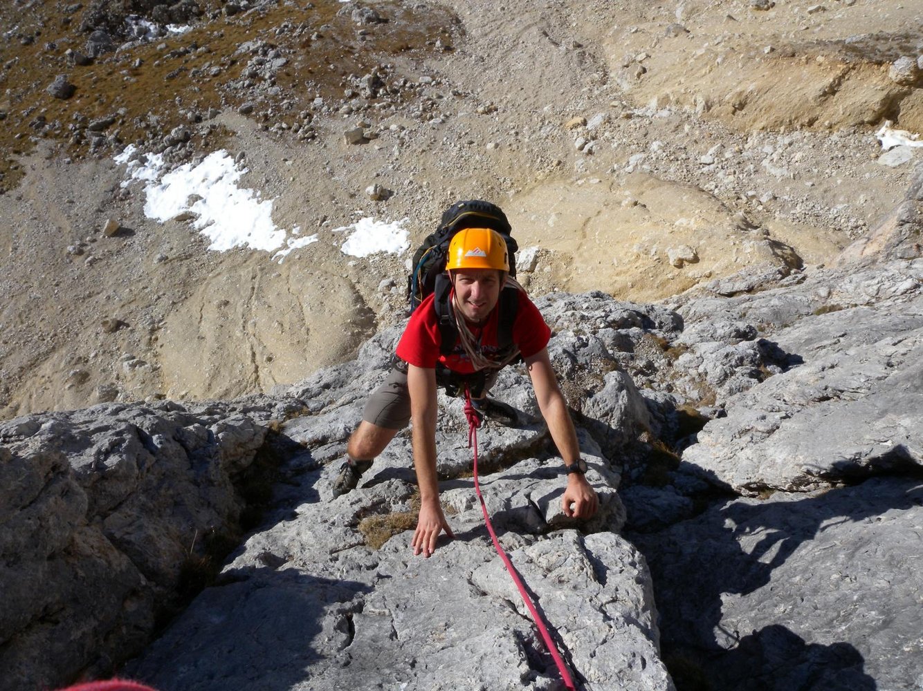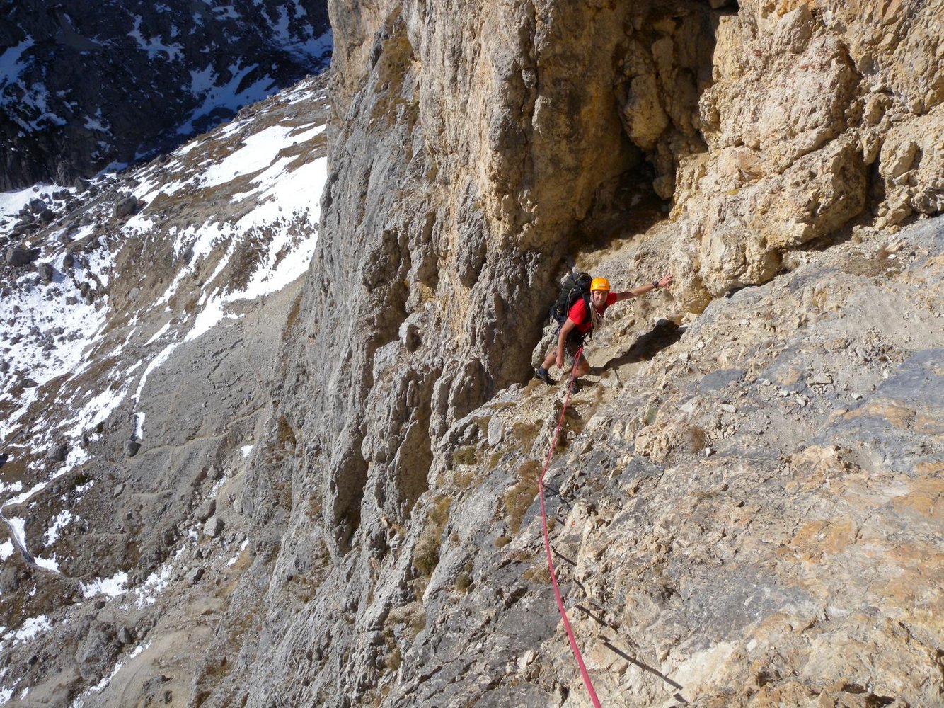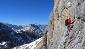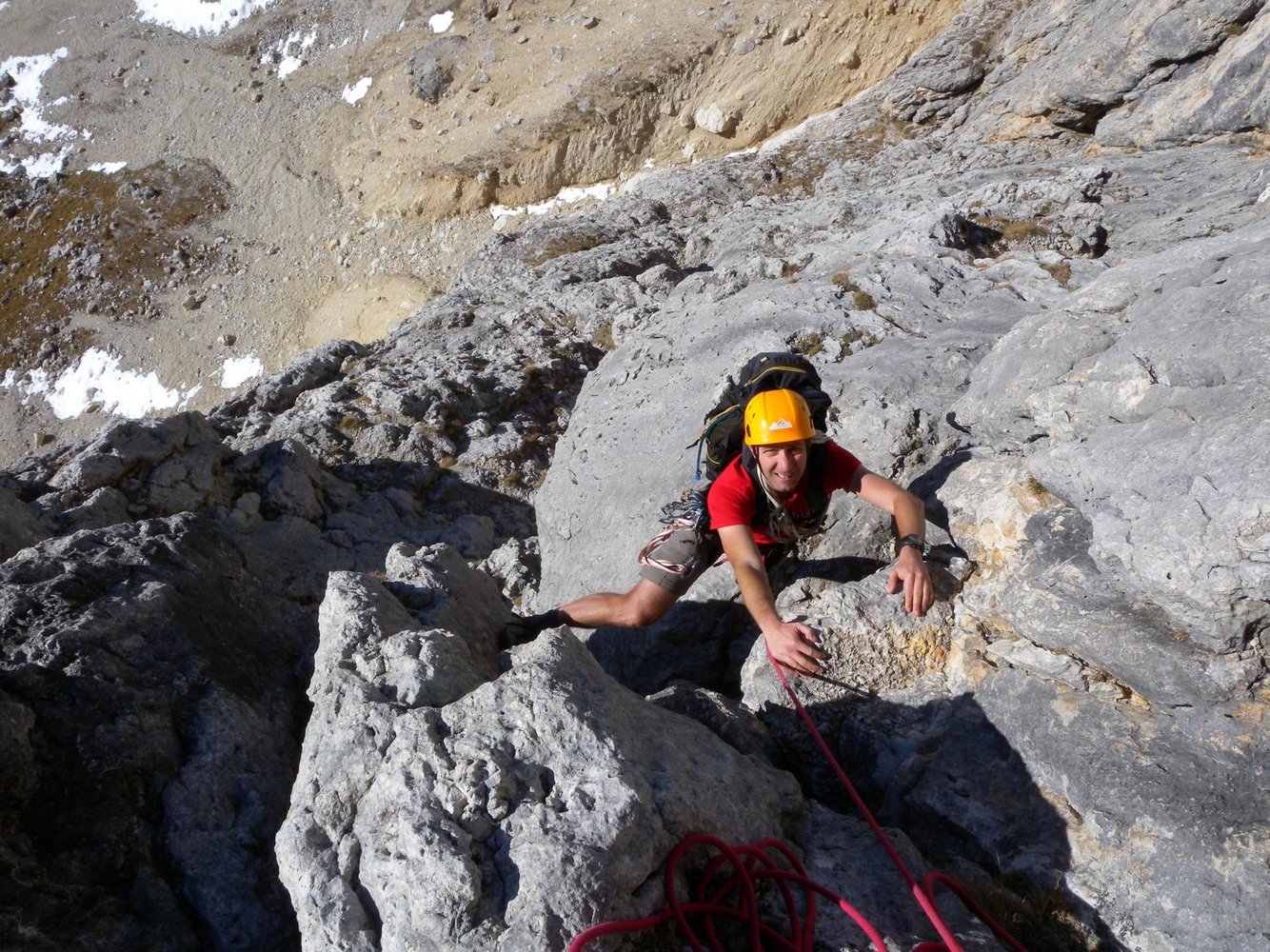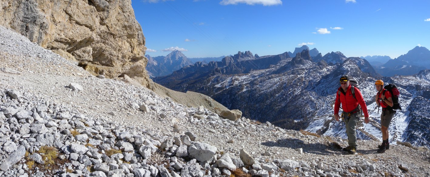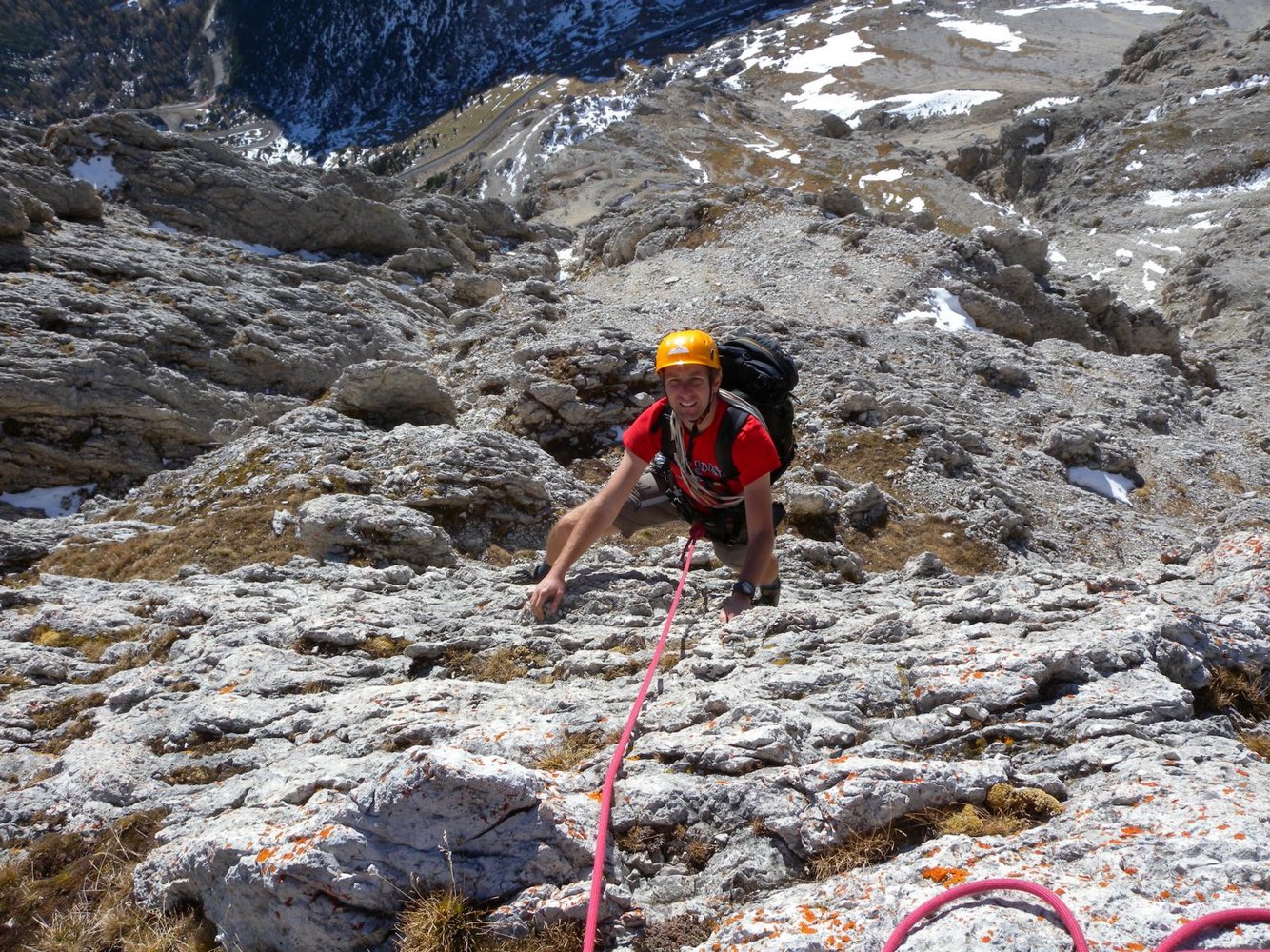 Lohnende und wegen der niedrigen Schwierigkeit sehr beliebte Kletterei am Falzaregopass. Die Tour verläuft im unteren Teil meist über sehr guten Fels, für den oberen Teil brauchst man wegen des nicht ganz so festen Gesteins etwas mehr Erfahrung. Macht man beide Teile gemeinsam, kommt eine recht stattliche Mehrseillängentour heraus, wo man im Nahbereich des Gipfels aussteigt. Von oben hat man einen fantastischen Ausblick auf die Fanesgruppe, den Sellastock und die weißen Gletscherhänge der Marmolada. Eine Top-Dolomitentour mit kurzem Zustieg. Tipp: Wer eine Stirnlampe mitnimmt, kann beim Abstieg noch die Galleria del Lagazuoi (Kriegsstollen) begehen. Der ganze Lagazuoi ist mehr oder weniger ausgehöhlt (Infos an der Talstation, der Stolleneinstieg ist bei der Bergstation). Die Tour wurde in mehreren Varianten erstbegegangen. Wir beschreiben hier die leichteste Möglichkeit die Wand zu durchsteigen.