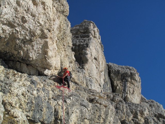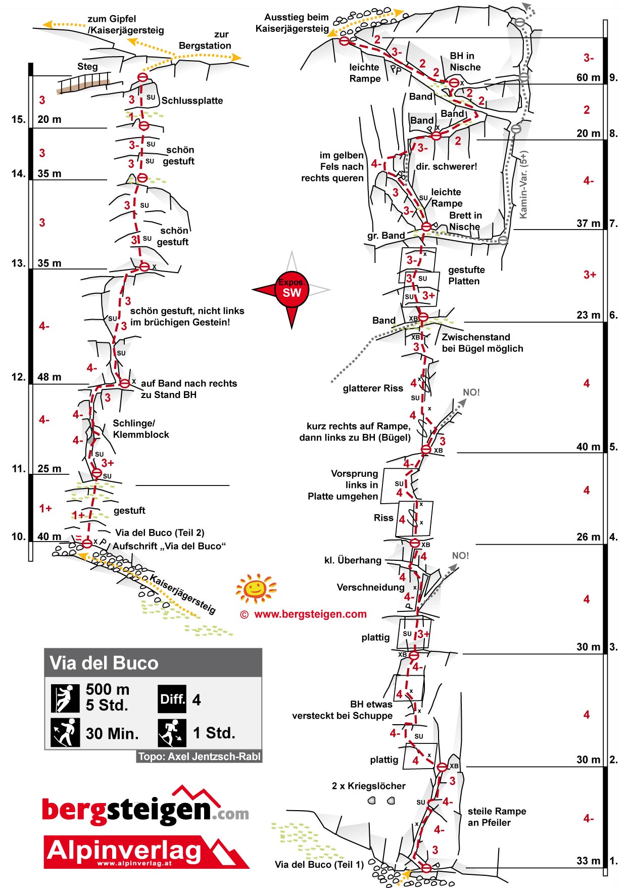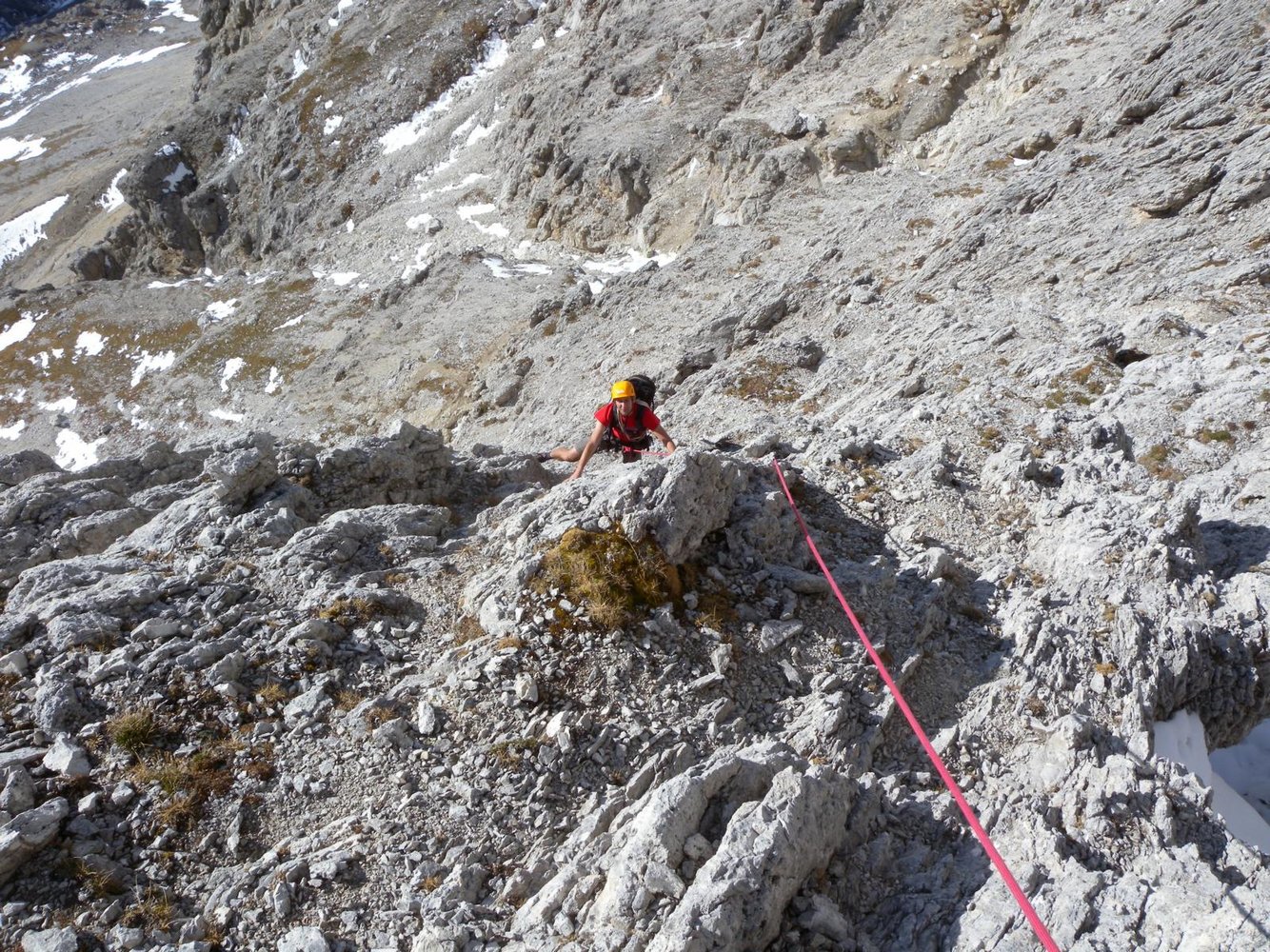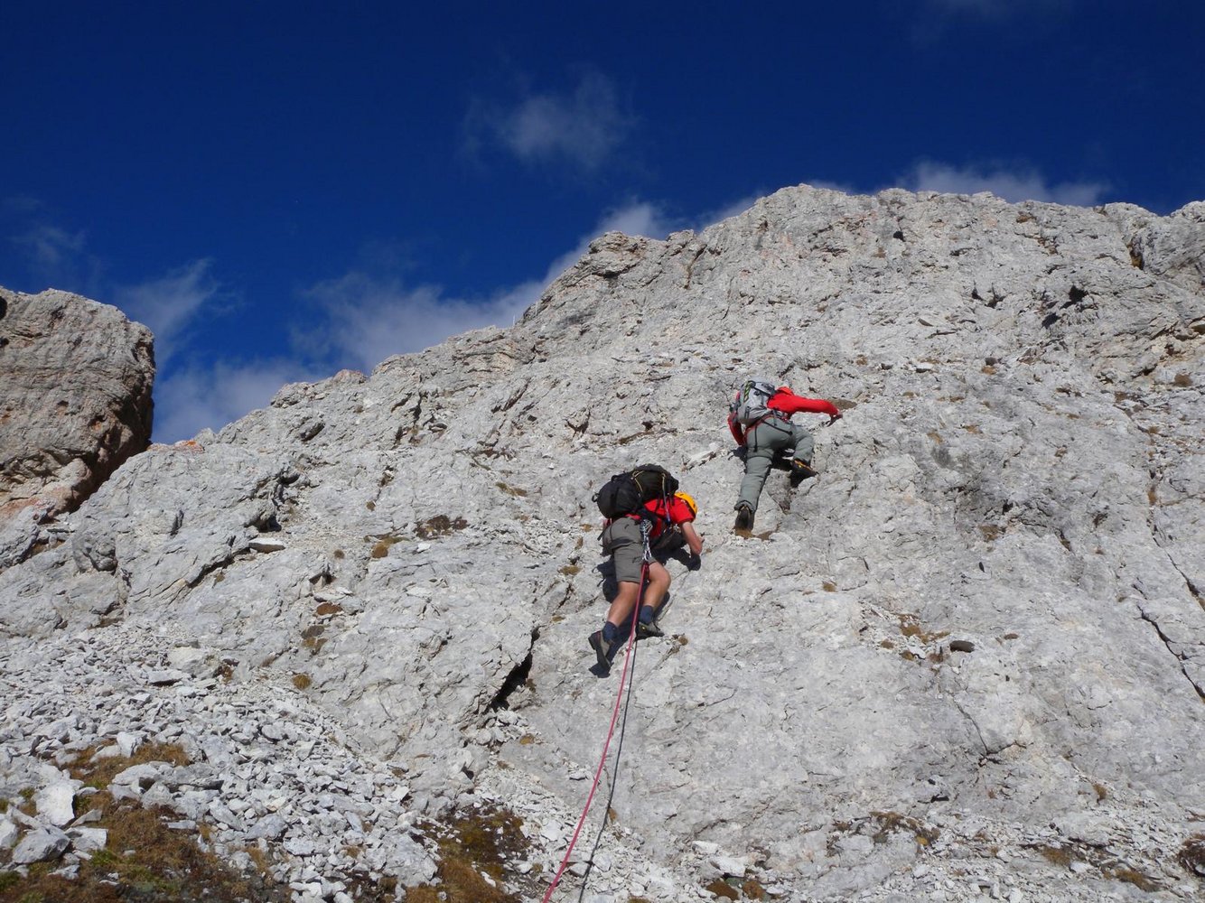 Den vierten Grad sollte man schon gut klettern um die Tour stressfrei zu bewältigen. ACHTUNG: Im oberen Teil sollte man darauf achten, keine Steine loszutreten (was gar nicht so leicht ist)! Direkt darunter verläuft der Kaiserjägersteig, auf dem sind in der Regel sehr viele Touristen unterwegs (die keinen Helm tragen).