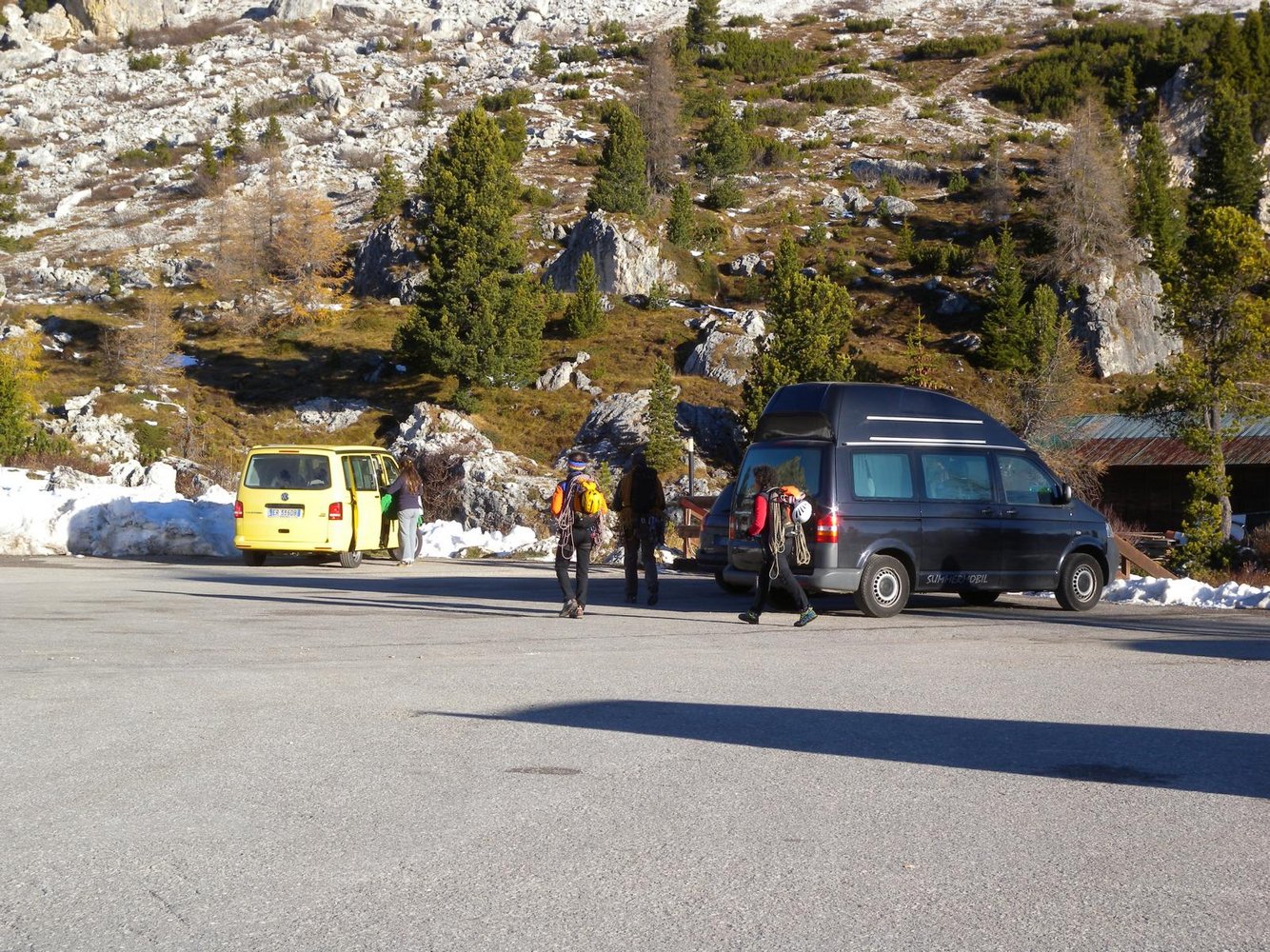 Von Toblach nach Cortina und weiter auf den Passo Falzarego bzw. über Bruneck nach Abtei und von dort auf den Passo Falzarego. Auf der Passhöhe bei der Seilbahn parken.
