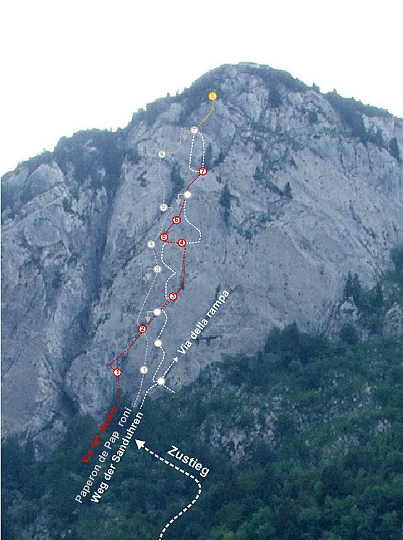 Die Via del Diedro ist vielleicht ein bisschen unbekannter wie die Via della Rampa, steht ihr jedoch um nichts nach. Auch hier bombenfester kletterfreundlicher Fels und sehr schöne Riss-, Verschneidungs- und Plattenkletterei, vielleicht sogar die abwechslungsreichste Tour am Panettone. Von der Absicherung her eher alpin, sind die Stände gebohrt und auch an den schwersten Stellen stecken Bohrhaken. Dazwischen ist jedoch an einiges an Platz für Cams und Keile, die jedoch gut zu legen sind. Empfehlenwert ist es, die letzten Länge der Via della Rampa (5c+) noch anzuhängen.