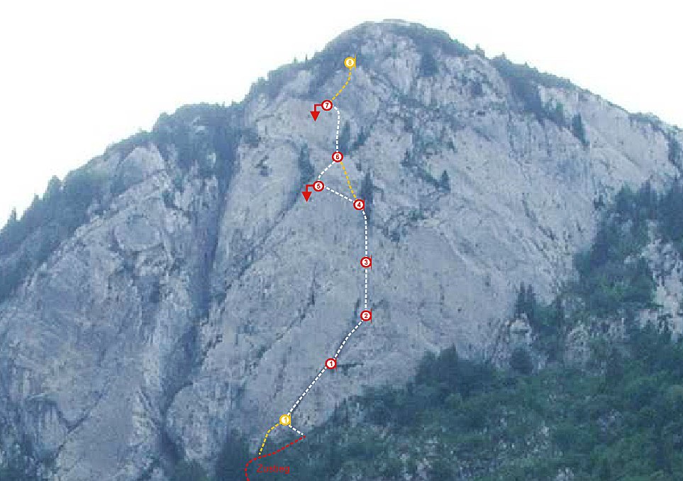 Auf der äußeren Seite der Kehre ist ein "P" auf einen Felsen gemalt. Hier in östlicher Richtung in den Wald und auf kleinem Steig zunächst flach, dann steil rechts hinauf zu einem kleinen Geröllfeld. Dieses 20Hm hinauf und bei Steinmann wieder verlassen. Auf Steig weiter steil hinauf zu kurzer Fixseilpassage und zum Wandfuß. Nun rechts über eine Rampe (anfangs kurze Schrofenpassage) 30m zum eigentlichen Einstieg bei einer kurzen nach links ziehenden Rampe, die zur markanten nach rechts ziehenden Felsrampe führt.