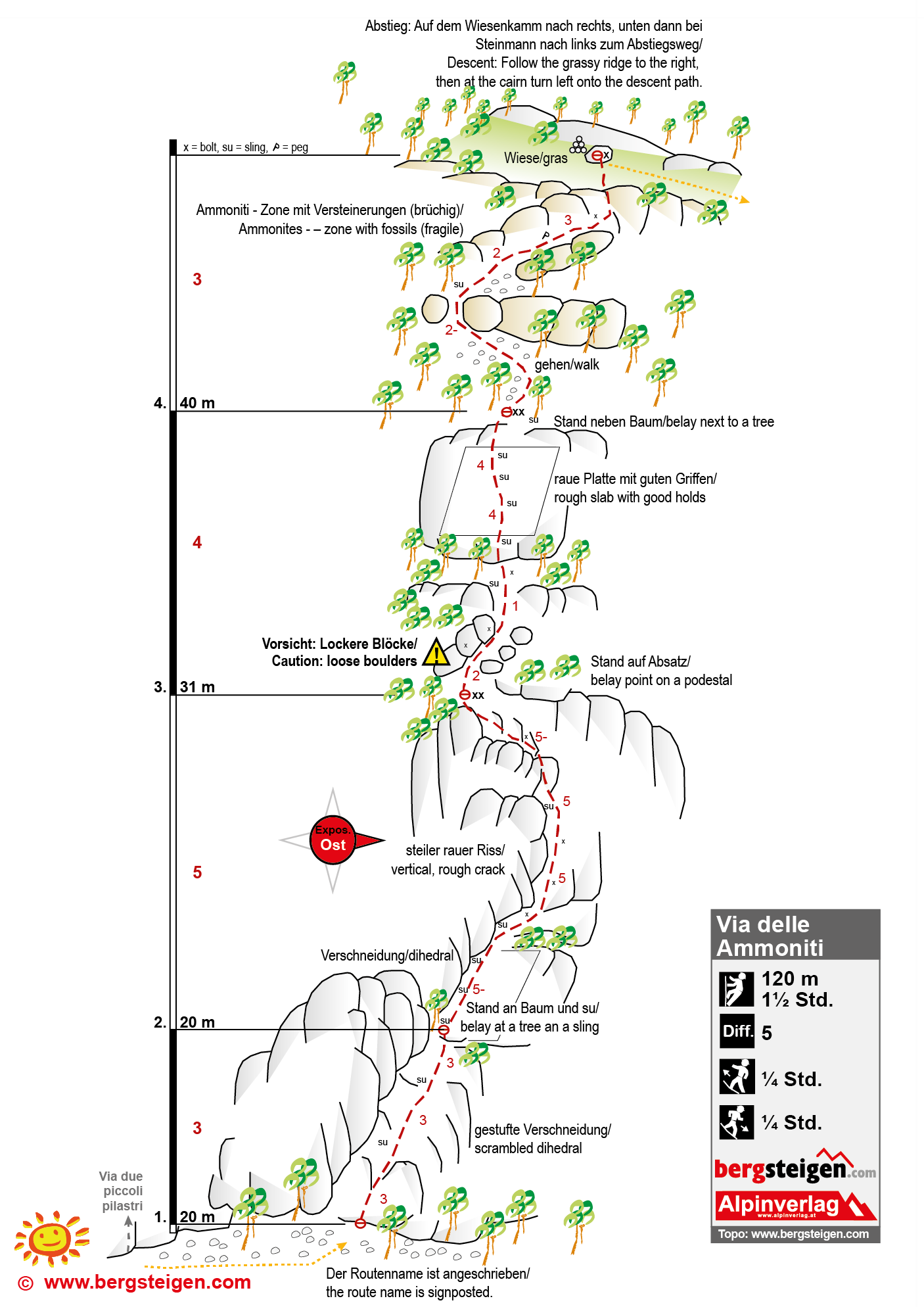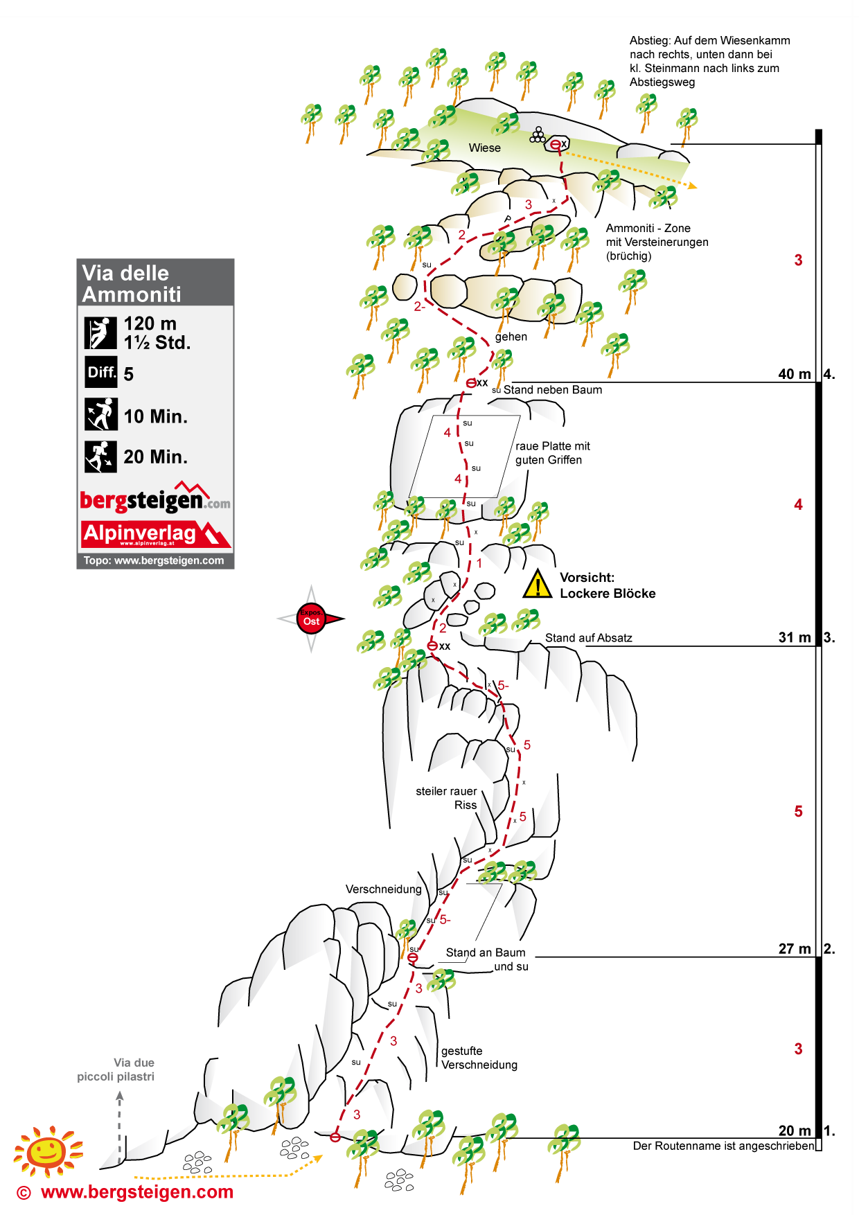 Schöne, sehr leichte Genussklettertour im ganz rechten Teil der Parete San Paolo. Die Tour ist für die Schwierigkeit lohnend und hat nur in der letzten Seillänge eine kurze Gehpassage. Die Tour spircht vor allem Einsteiger an und wurde von den Erstbegehern deshalb auch mit einigen Bohrhaken ausgestattet. Die Ammoniti sind Versteinerungen, die man in der letzten Seillänge sieht - neben den Form sollte man dort aber auch einen Blick auf die Festigkeit werfen (etwas brüchig). Gesamt eine gelungene Tour die bei unsicherem Wetter oder als Zweittour für den Einstieg zu empfehlen ist!