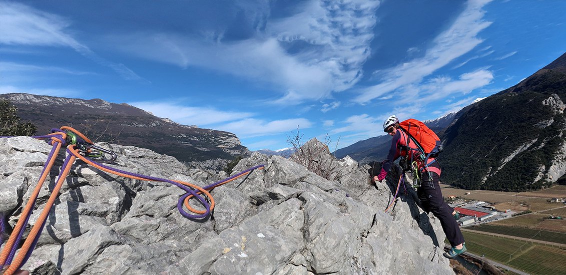 60 m Einfachseil, 10 Expressschlingen, Bandschlingen für Sanduhren und Baumstände, evtl. ein paar mittlere Friends, sowie einen Helm.