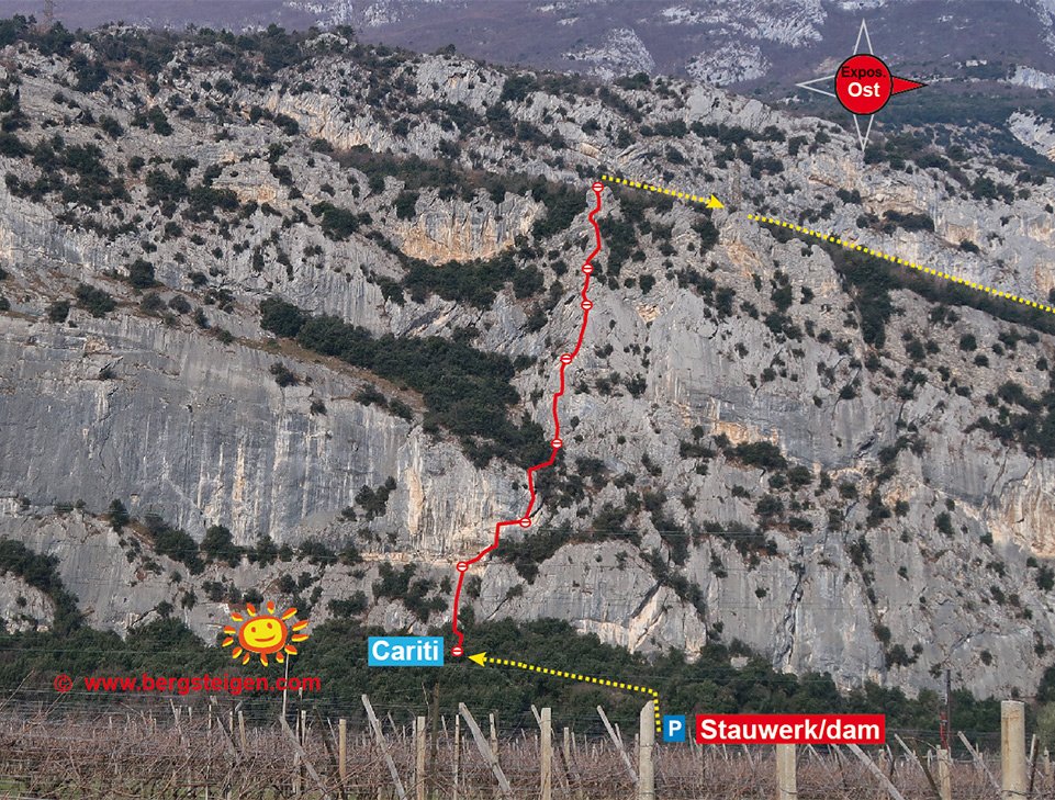 Die Via delle Cariti ist eine angenehm zu kletternde Tour im mittleren Schwierigkeitsgrad an den Ostwänden der Parete San Paolo. Den Erstbegehern um Heinz Grill ist es gelungen, eine schöne Linie durch die in diesem Teil etwas gestufte Wand zu finden. Die Kletterei ist abwechslungsreich, raue steile Wandpassagen, Platten mit schönen Tropflöchern und gestuftes, aber nie wirklich schlechtes Felsgelände wechseln einander ab. Die Tour wird vermutlich bald zu den beliebten Zielen an der San Paolo Wand gehören.
