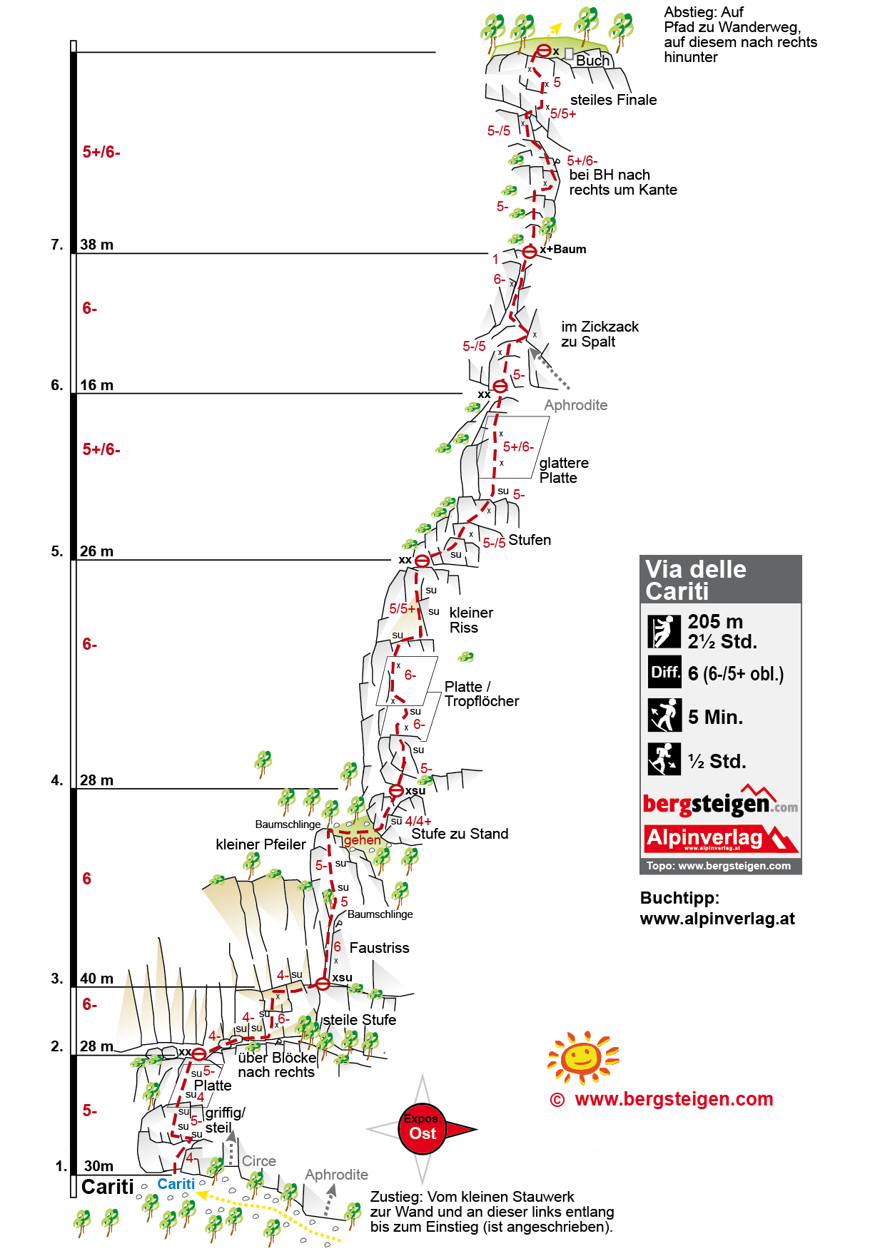 Vom Parkplatz bei der kleinen Stauanlage zur Wand und dort nach links zum Einstieg. Die Tour ist links von der Circe bzw. Aphrodite und mit blauer Schrift angeschrieben.