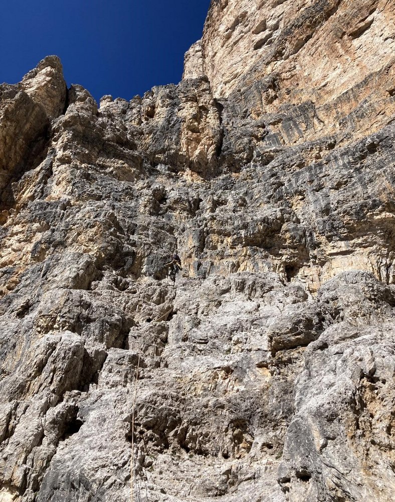 Diese klassische Route führt durch die komplexe Südwand der Tofana mit ihren beiden Amphitheatern. Die auch nur Dimaiführe genannte Tour gilt als eine der schönsten Kletter-Routen in der gesamten Wand und führt durch einer einzigartigen Umgebung. Trotz ihres niedrigen Schwierigkeitsgrades erfordert die Route ein gewisses Maß an alpiner Erfahrung bei der Routensuche und, angesichts ihrer Länge, auch Ausdauer. - Ganz großes Kino anno 1901!