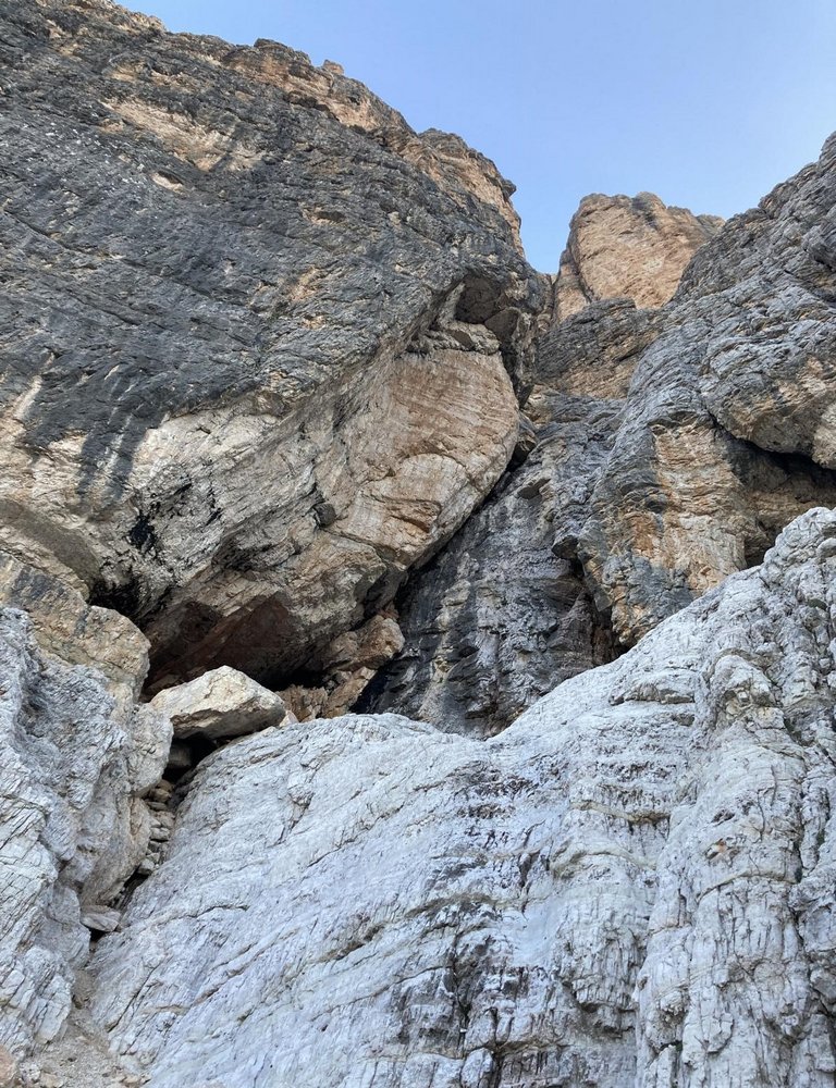 Vom Rifugio Angelo Dibona auf dem Weg 403, beim Materialaufzug aber links, direkt hinauf an den Wandfuß der mächtigen Tofana Südwände, wo man man auf den Querweg (404) trifft. Diesem folgt man nach Westen bis in Falllinie des großen Amphitheaters der Südwand. Unbegrünte Schuttrippen passieren, weiter westlich erst die leicht begrünte Rippe rechts vom Weg abzweigend ansteigen, zuletzt über Schutt hinauf zur Grotte mit großem weißen Klemmblock (siehe Photos).