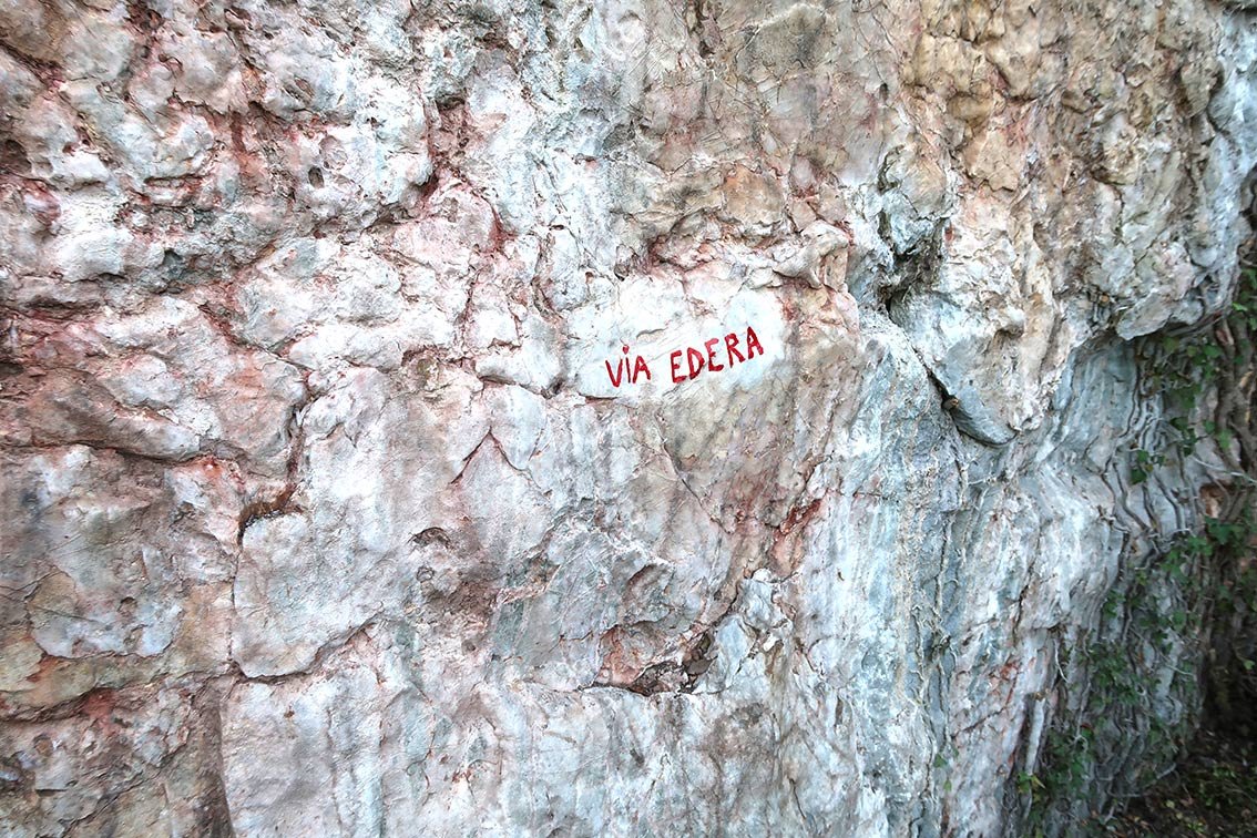 Vom Parkplatz auf einer asphaltierten Straße in Richtung Westen. Am Ende, schon den Ostwänden des Monte Baone nahe, auf einem steilen Asphaltweg aufwärts. Dieser wird zu einem Schotterweg, der nach einer kleinen Schutthalde direkt an die Felswand heranführt. Zur Via Edera kurz nach links entlang der Felswand. Der Routennamen ist angeschrieben - siehe auch Übersichtsbild. Am direkten Einstieg gibt es eine versteinerte Schnecke.