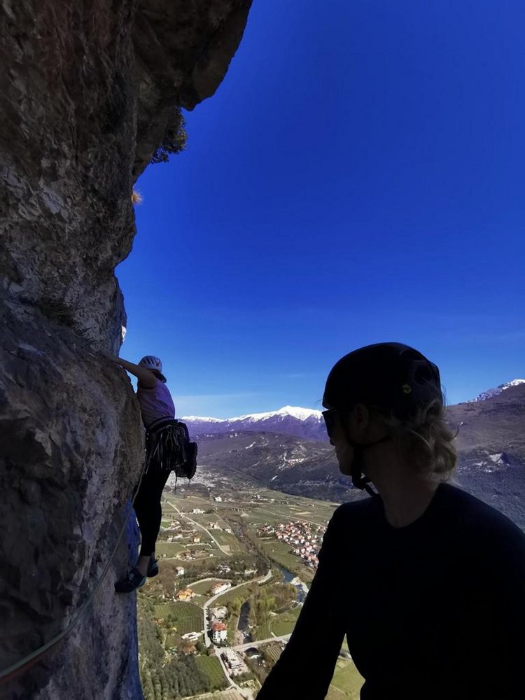 Die Route Essusiai ist eine schöne, abwechslungsreiche Route neben dem Megaklassiker "Archangelo". Die Tour wird nach oben hin immer besser. Schwierige Stellen sind gut abgesichert. In den Rissen, Verschneidungen und leichten Seillängen ist Eigeninitiative bei der Absicherung gefragt, bzw. muss man in den Plattenstellen schon mal ein bisschen über den letzten Haken rausklettern. Das Highlight der Tour ist auf jeden Fall der Mega Überhang in der 2. Schlüsselseillänge. Dort muss man sich nach Plattentraversieren über einen riesigen Bauch hieven. Die letzten beiden Längen können auch in der Via Archai fertiggeklettert werden (laut Arco Hohe-Wände-Führer schöner). Wir fanden die vorletzte Länge aber noch sehr lohnend! Zuerst ein kurzer Kamin und dann eine grandiose Piazschuppe!