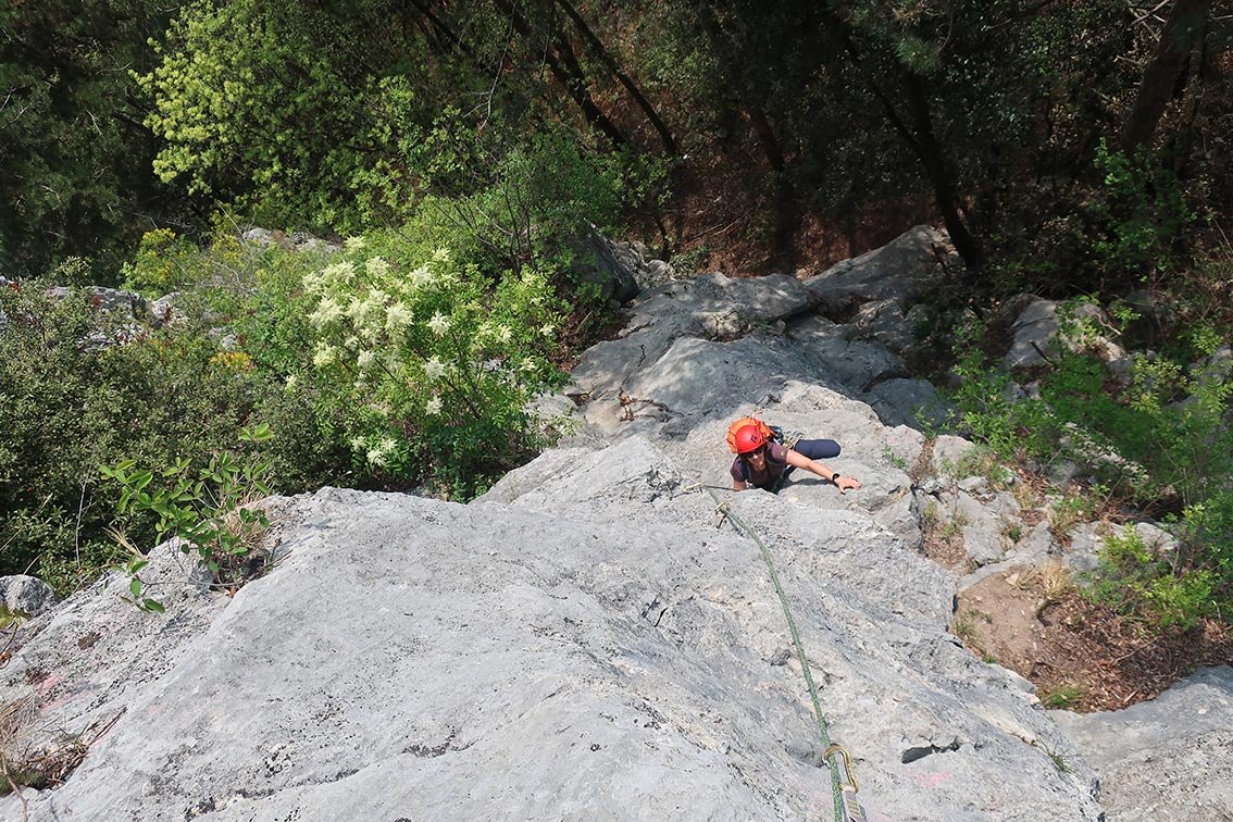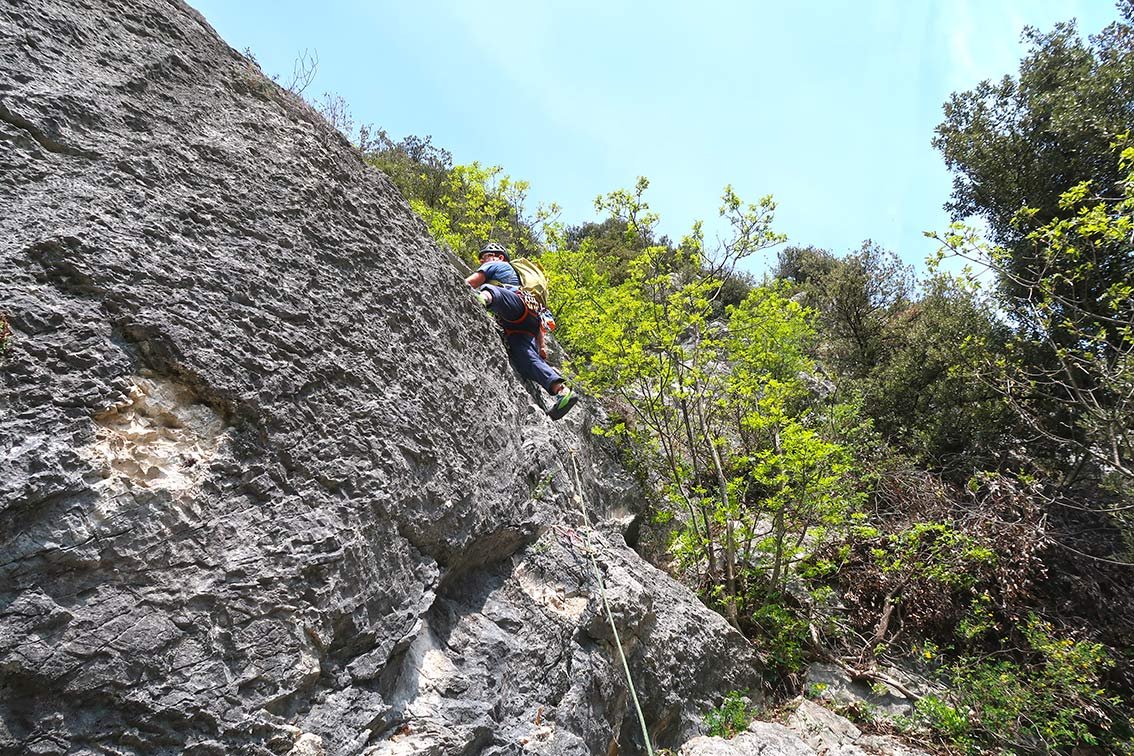 Zur Pizzeria Lanterna und die Straße kurz zurück in Richtung Arco - ein Steiglein führt hinauf zum Klettergarten (mit einem markanten Doppelrissdach). Links auf dem breiten Pfad der Wand entlang, dort wo der Pfad etwas ansteigt, kommt man direkt am Einstieg vorbei. Die Route ist blau angeschrieben. Die Route verläuft im linken Wandteil der Parete San Paolo.