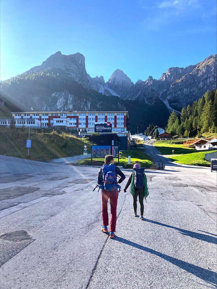 Am besten über die Tour abseilen (einmal 50 m und einmal 30 m). Wenn man alle 4 SL klettert, kann man oben auch zu Fuss absteigen (ist aber nicht sehr lohnend). Beim Ausstieg quert man nach links so lange, bis man auf den Halsl-Steig kommt und von dort wieder zurück absteigen.