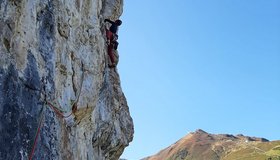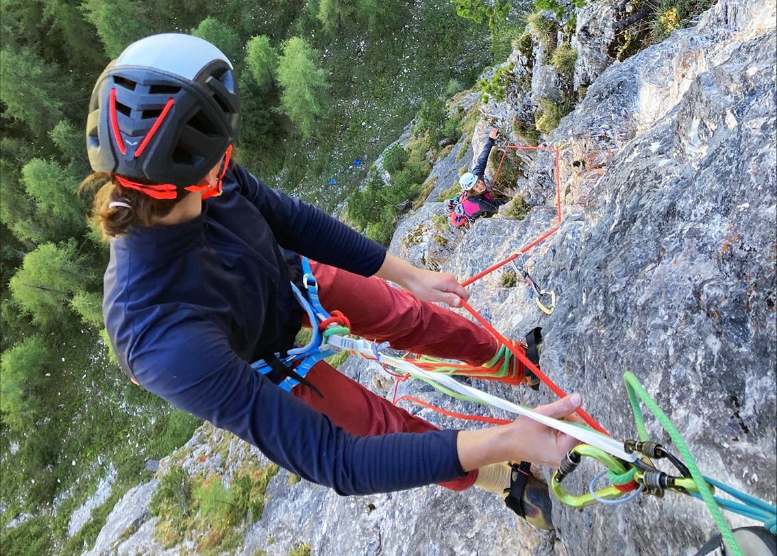 2 x 50 m Halbseile, 15 Expressschlingen und Helm.