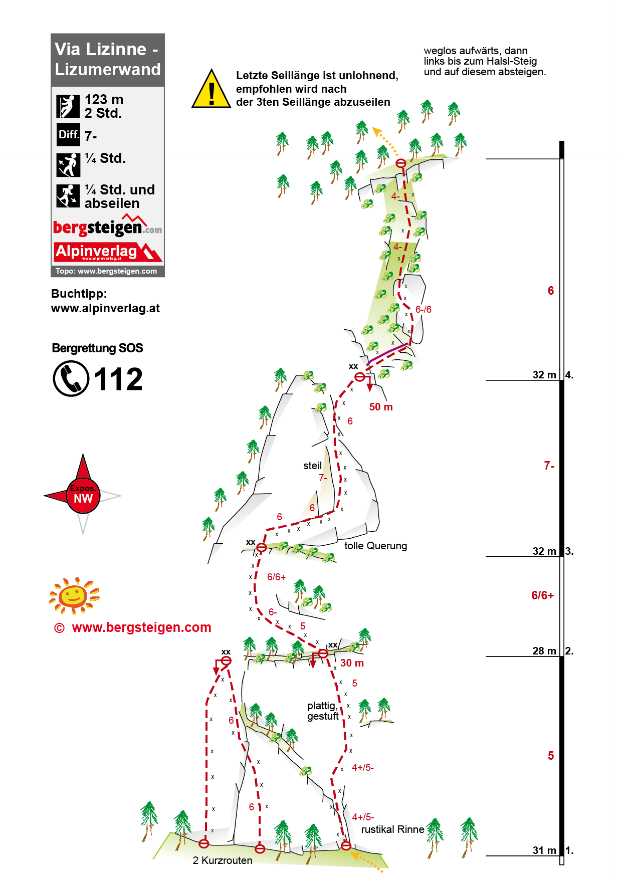 Die Via Lizinne ist eine kurze, mit Bohrhaken gesicherte Route an der Lizumerwand. Der Zustieg ist genauso kurz wie die Kletterei - die Route ist ideal, wenn man einmal etwas Abwechslung vom Martinswandspeck braucht. Teilweise ist der Fels, vor allem weiter oben, etwas brüchig. Empfehlenswert ist diese Tour vor allem an warmen Tagen, weil die Wand lange im Schatten liegt.