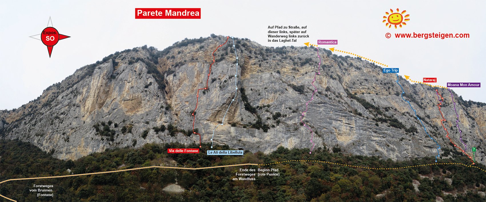 Vom Ausstieg auf Wegspuren nach Westen zur Asphaltstraße und dieser nach links folgen bis nach einer großen Wiese rechts und einigen Häusern links auf der linken Seite ein Wanderweg wieder nach Südosten zur Wand führt (dieser steigt auch mal kurz an, man geht eine Strecke direkt an der Felskante). Auf diesem Wanderweg nach Laghel absteigen, dann aber links (guter Wanderweg, rote Punkte) zurück zum Zufahrtsweg. Auf diesem dann zum Kreuz beim Brunnen (Fontane).