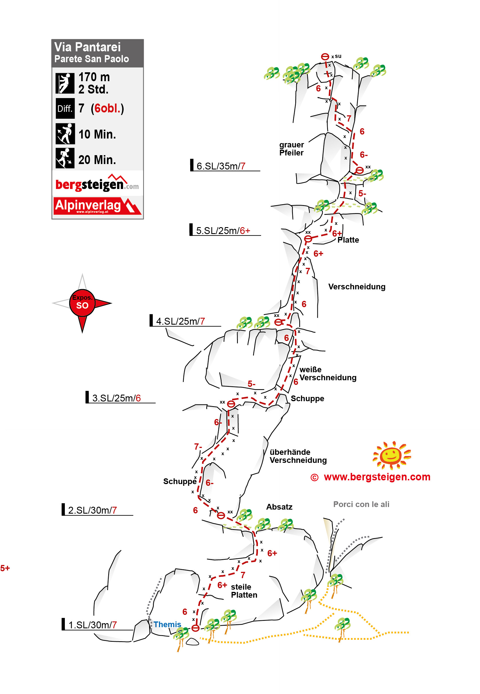 Vom Beginn des Zugangsweges zur Einsiedelei S. Eremo nach links auf einem Pfad zur Wand. Entlang der Wand vorbei an einem Wegweser-Stein bis der Pfad kurz absteigt und wieder direkt zur Wand führt. Hier ist der Einstieg. An Bäumen ist Pant eingeritzt und beim Einstieg liegt ein Block mit einem Bolt ohne Lasche. 6 m links ist die Route Themis und ca. 20 m rechts und deutlich oberhalb die Route Porci con le ali.
