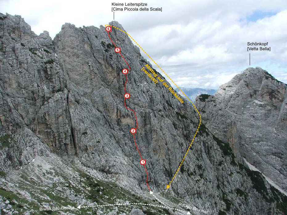 Vom Ausgangspunkt (989m) an der SS 76 folgt man dem markierten Steig 625 in das Weissenbachtal (Rio Bianco) bis zum Rifugio Brunner. Hier folgt man dem Steig in Richtung Korscharte bzw. Bivacco Gorizia. Noch bevor man zu den Biwakschachteln kommt, erreicht man den Wandfuß der Leiterspitzen Südwand. Man sieht hier eine markante Rampe diagonal von rechts durch die Wand herunterziehen (über sie folgt auch der Abstieg). Etwa 20 Meter rechts vom Beginn der Rampe ist der Einstieg der Route (Bohrhaken).