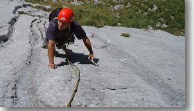 Vier Seillaengen 6 (6- obl): 4+, 6-, 6, und 6-, dann die Wetzsteinplatte weiter ( 4+, 5-, 6-, 4+ und 4-).