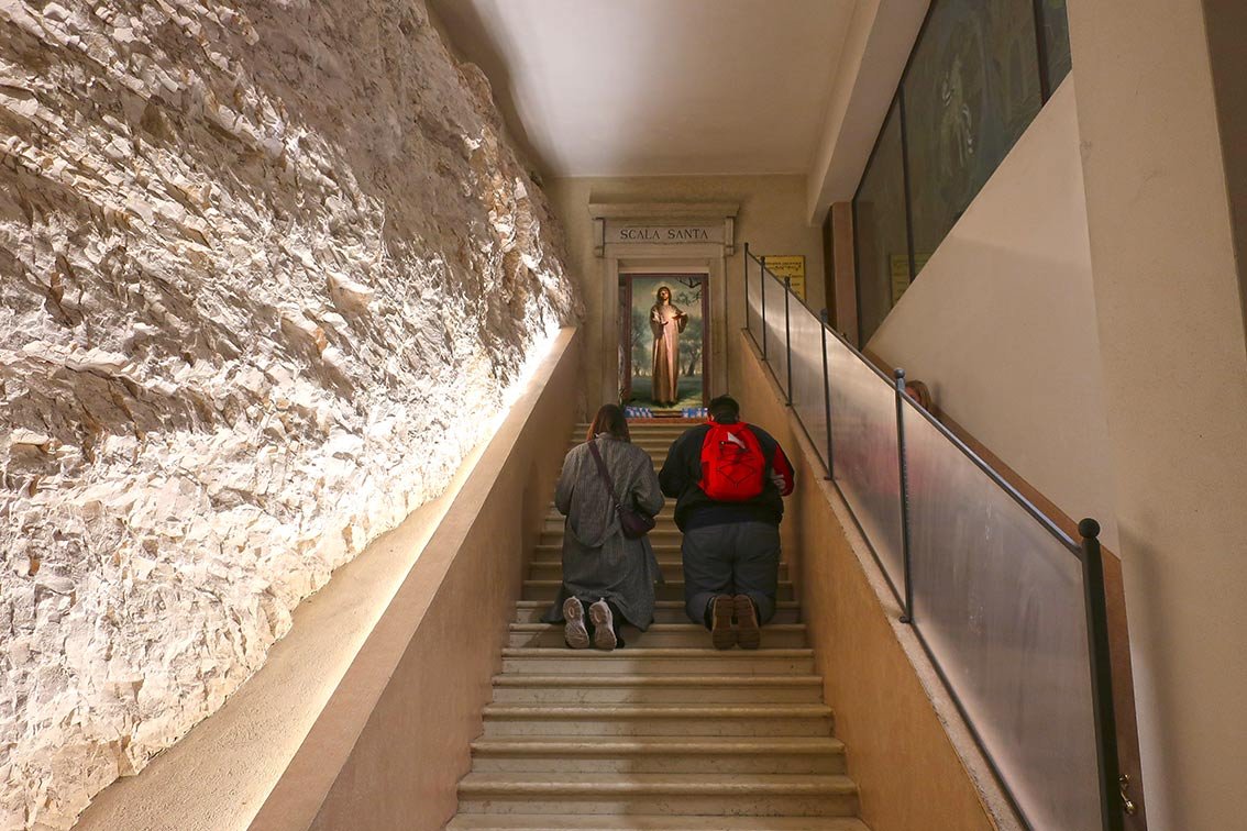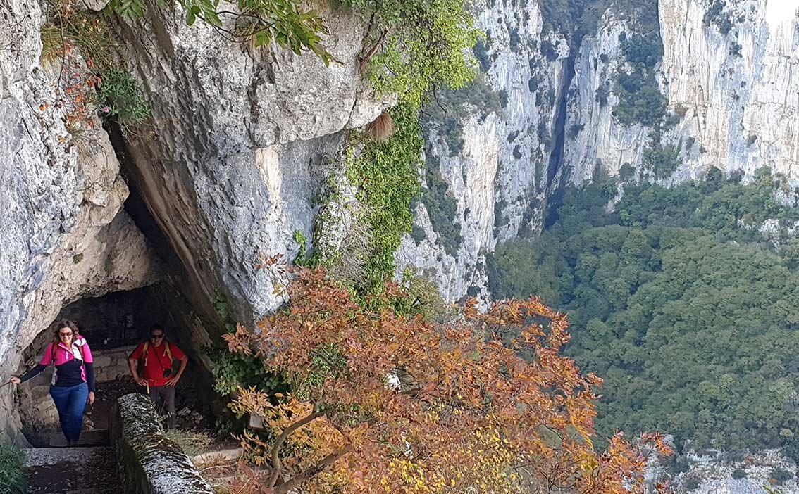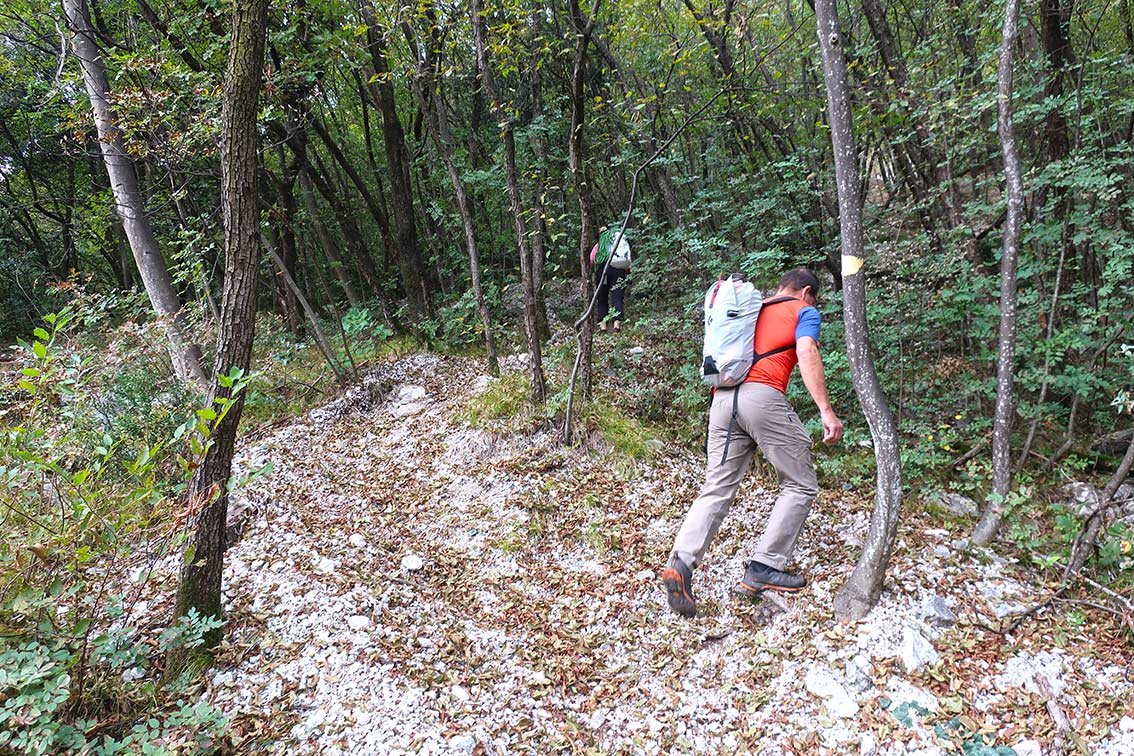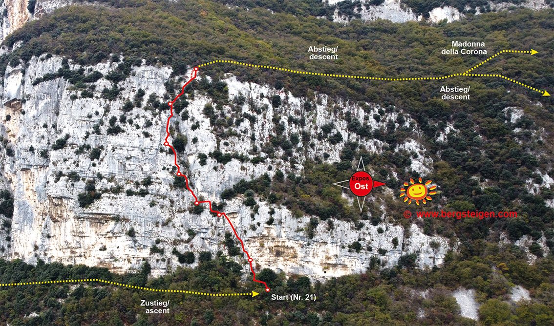Abstieg mit Madonna della Corona (siehe auch Track): Auf dem oben erwähnten Pfad etwas nach rechts, dann aber ca. 30 Hm hinauf zum darüber, parallel verlaufenden Wanderweg. Auf diesem gut markierten Weg quert man bis zum breiten Kreuzweg "Weg der Hoffnung" mit den rund 1500 Stufen (auf den Markierungssteinen werden über 1700 Stufen genannt). Auf dem Kreuzweg erreicht man in ca. 15 Minuten Aufstieg die Wallfahrtskirche Madonna della Corona. Von der Wallfahrtskirche auf dem Kreuzweg (im Felsteil ist dieser eindrucksvoll in einer steilen Felswand mit vielen Stufen angelegt) wieder hinunter nach Brentino. Im malerischen Örtchen nach rechts zur Kirche auf der Straße zum Parkplatz (ab Ausstieg Via Silvia dauert der Abstieg ca. 1.5 Stunden inkl. dem Aufstieg zur Wallfahrtskirche).