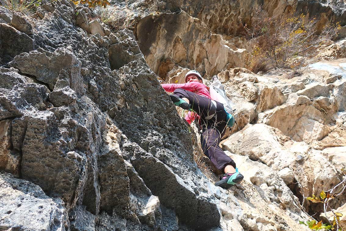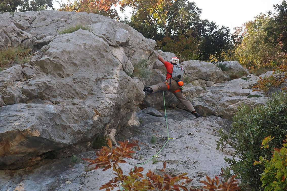 Die Tour ist gut mit Bohrhaken abgesichert (die Tour wurde saniert, die Bohrhaken sind nicht von 1983).