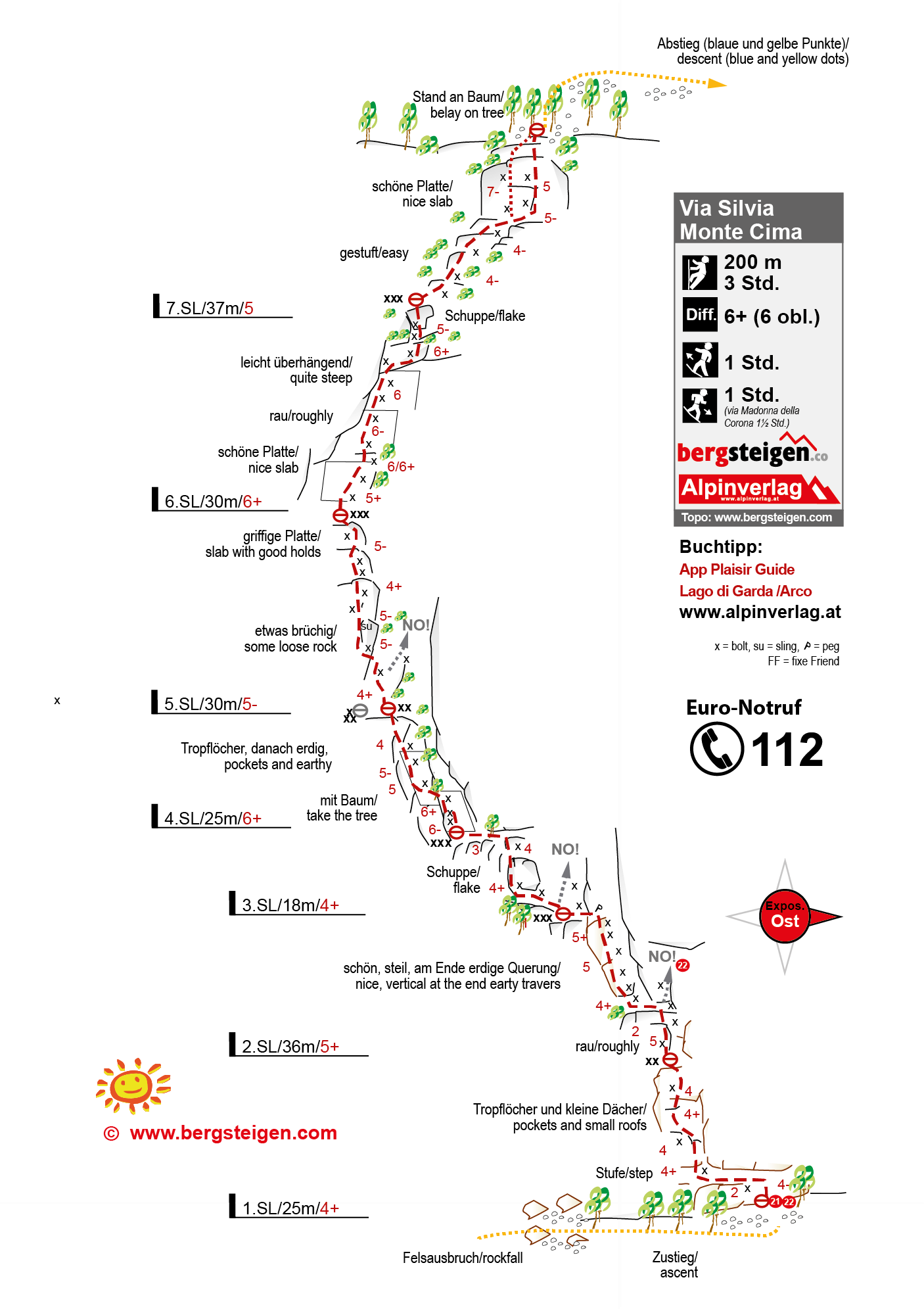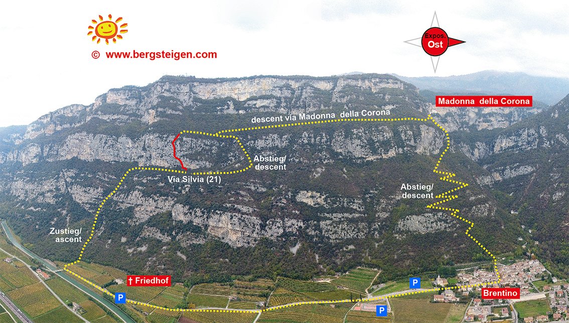 Via Silvia - selten ist sakrale Baukunst und Klettern so gut kombinierbar, man kann die Wallfahrtskirche Madonna della Corona (in den Felsen des Monte Cimo hoch oberhalb des Etschtales) gut in den Abstiegsweg mit einbauen. Die Kletterei an der Via Silvia ist ein Mix aus guten, bis sehr guten Seillängen, mit etwas rustikalen Felspassagen im Mittelteil. Die gute Klettertour an sich ist nicht herausragend - in Kombination mit dem Besuch von Madonna della Corona ist der Tagesausflug aber wirklich top!
