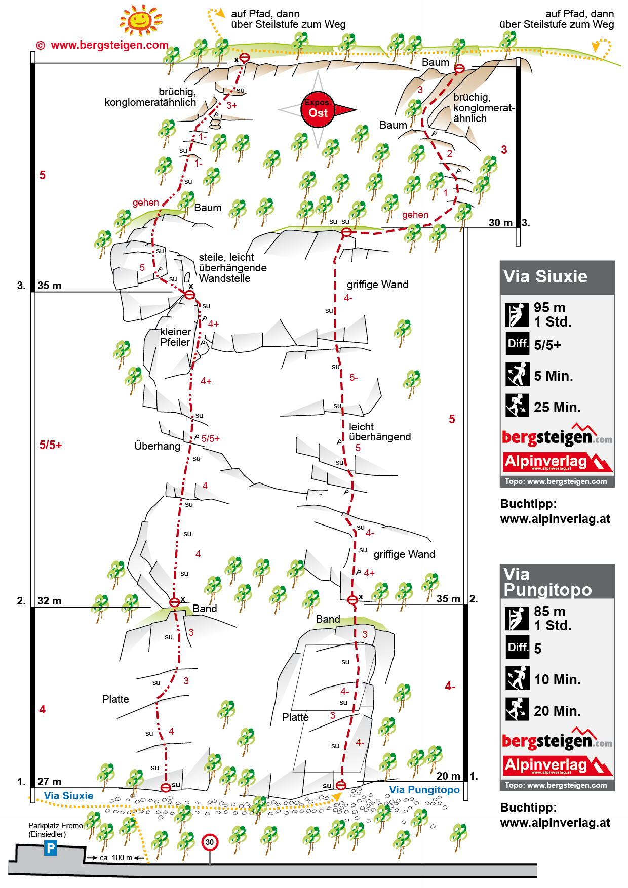 Die Via Siuxie ist eine nette, etwas gesuchte aber sehr gut geputzte Genussklettertour im ganz rechten Teil der Parete San Paolo. Die Route hat in der Mitte einen kleinen Überhang und am Beginn der letzten Seillänge eine etwas kräftigere Passage. Die Route eignet sich gut, um etwas den Umgang mit mobilen Sicherungen zu üben, da sich die vorhandenen Sicherungen noch deutlich ergänzen lassen.