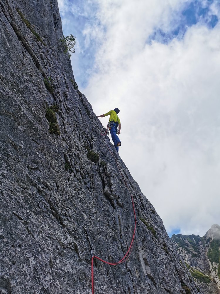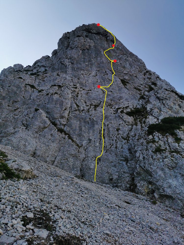 4.SL: Vom Standplatz gerade hoch zum 1. BH, von dort auf den Pfeiler nach rechts und hinauf in die schwer einsehbare Verschneidung (Schlüsselstelle). Der Verschneidung folgen, rechts am kleinen Dach vorbei, dann links den BH mit großen Abständen folgen. In der Letzen Verschneidung rechts hinaus über Schrofen zum Standplatz (Rocko Granato) mit Wandbuch.