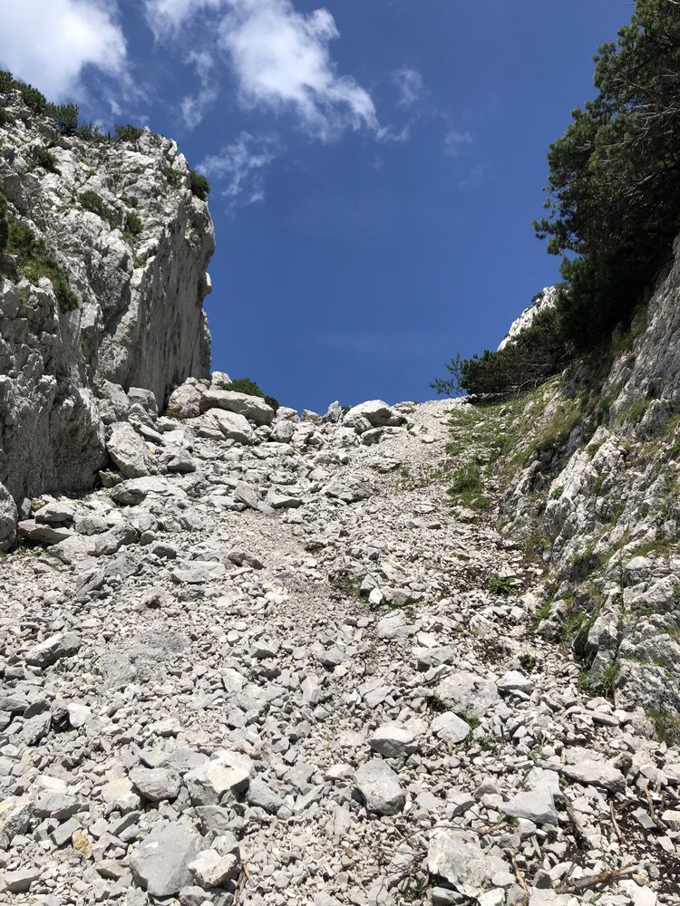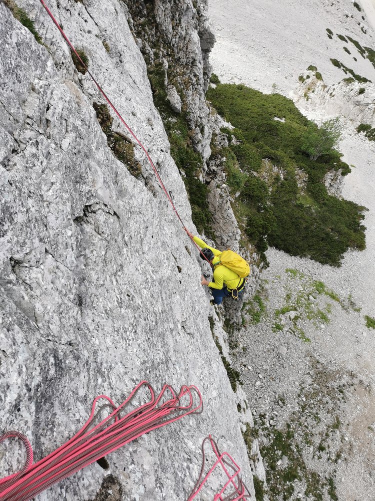 2.40m zwischen die Schuppe rechts vom Start. Obacht beim Abziehen, ggf. Steinschlag. Weit nach links aus der Steinschlagzone gehen.