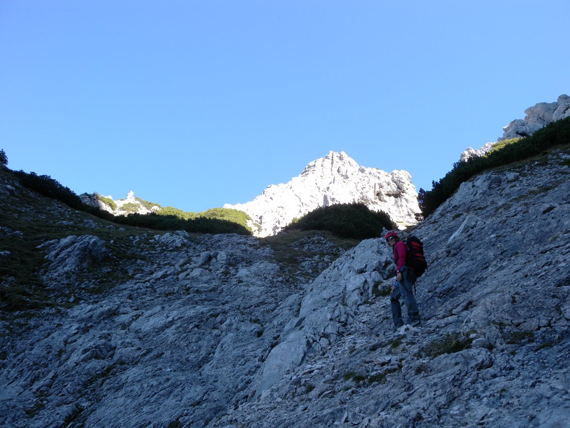 Der Anstieg verlangt seilfreies Klettern im 2ten Grad (Zustieg und Abstieg). Im Frühjahr liegt auf der Querung zum Dammkar länger Schnee (bessere Zeit ist Sommer bzw. Herbst).
