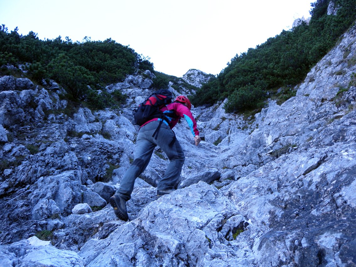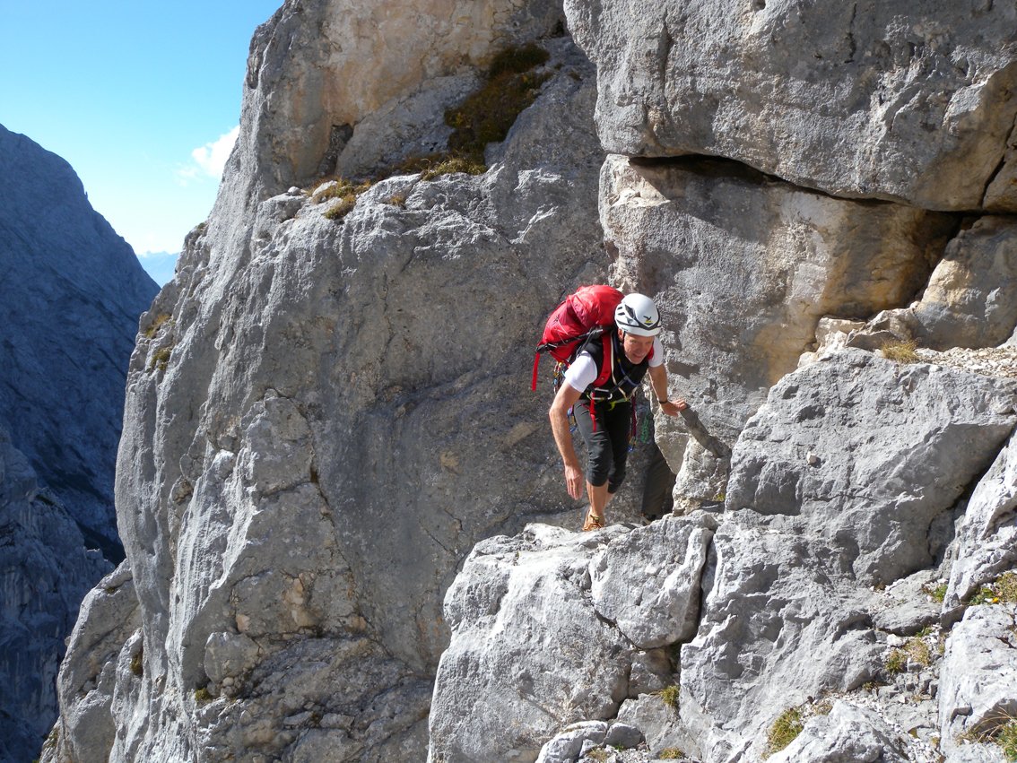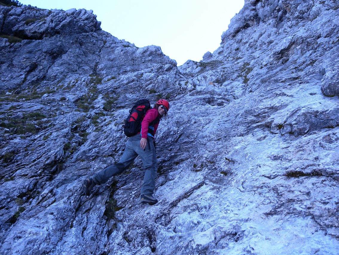 Beim Zustieg in der ausgewaschenen Rinne den Helm aufsetzen - Steinschlag durch andere Kletterer und Gämsen!