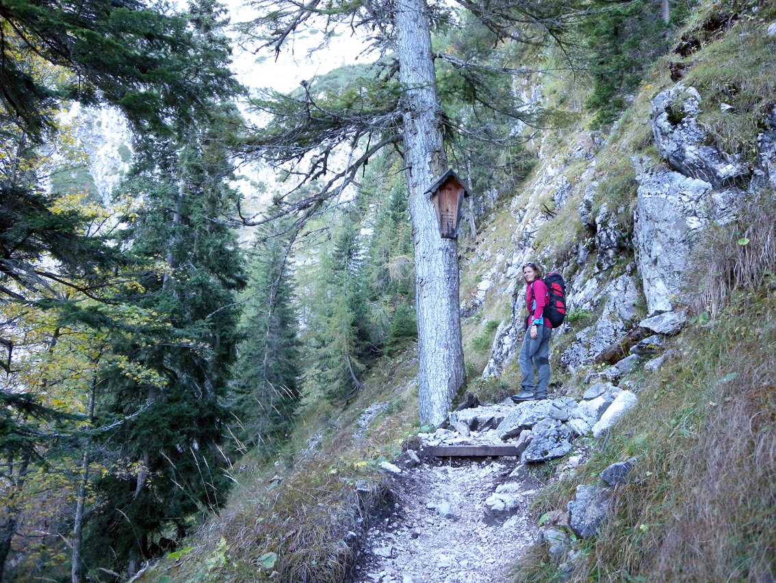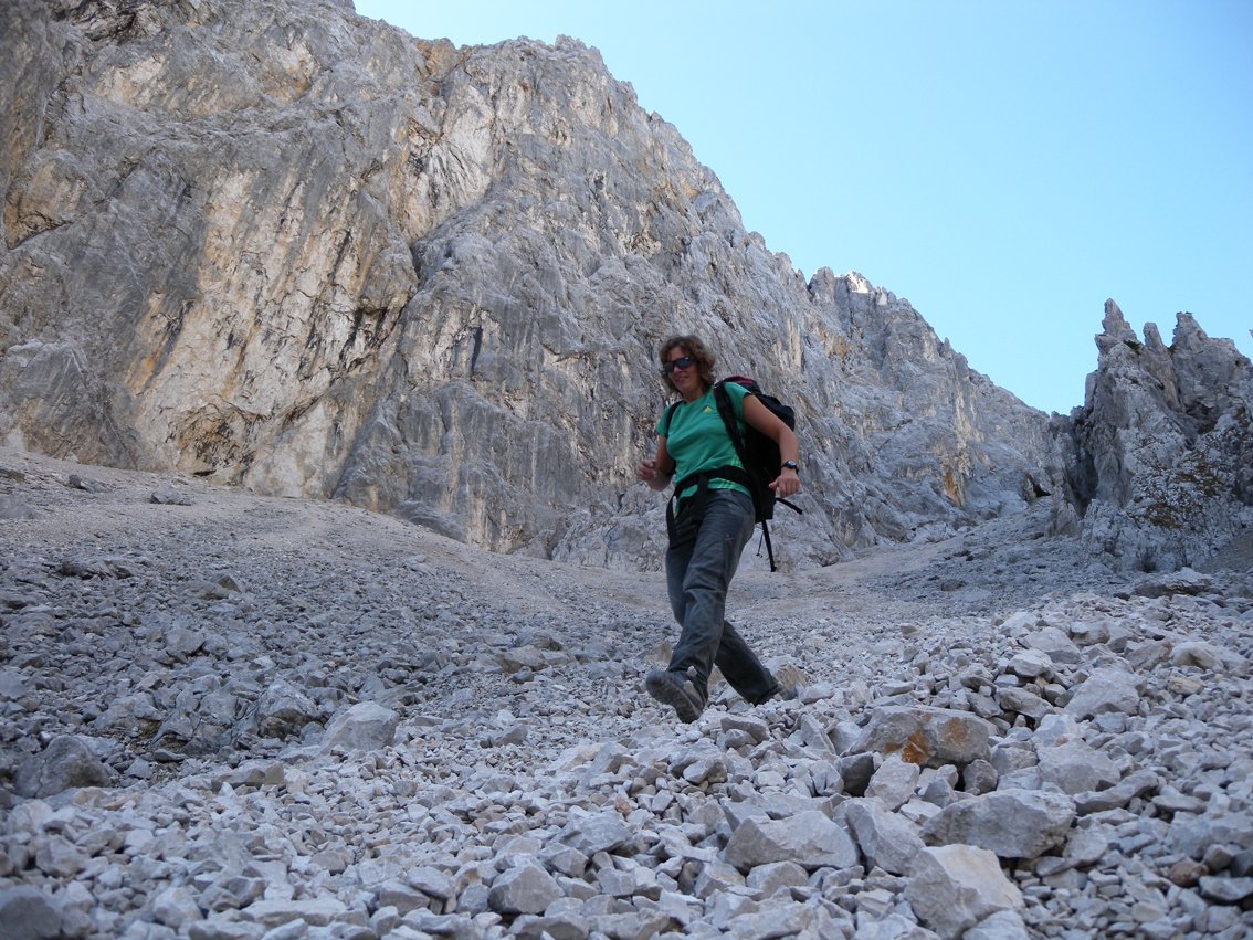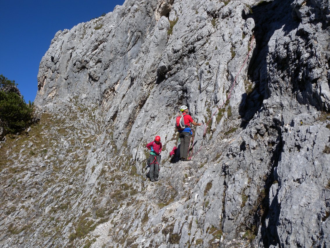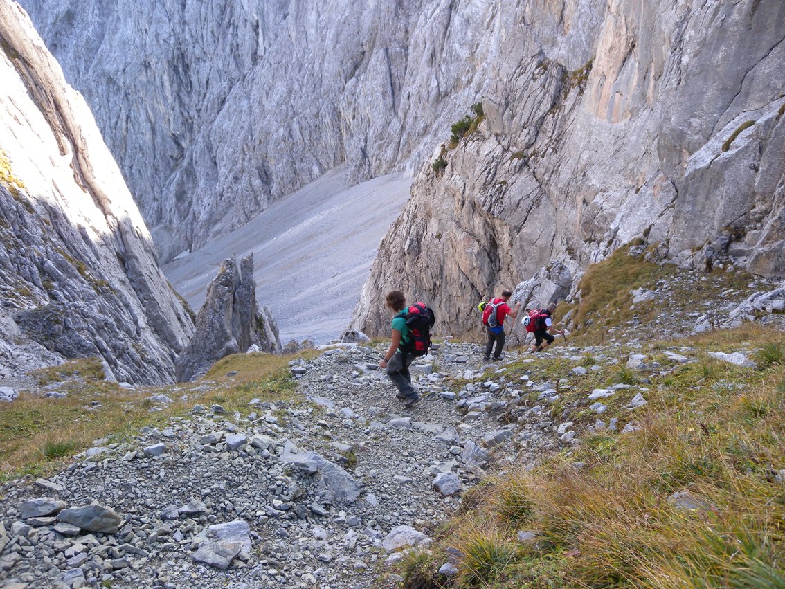 Beim Zustieg in der ausgewaschenen Rinne den Helm aufsetzen - Steinschlag durch andere Kletterer und Gämsen!