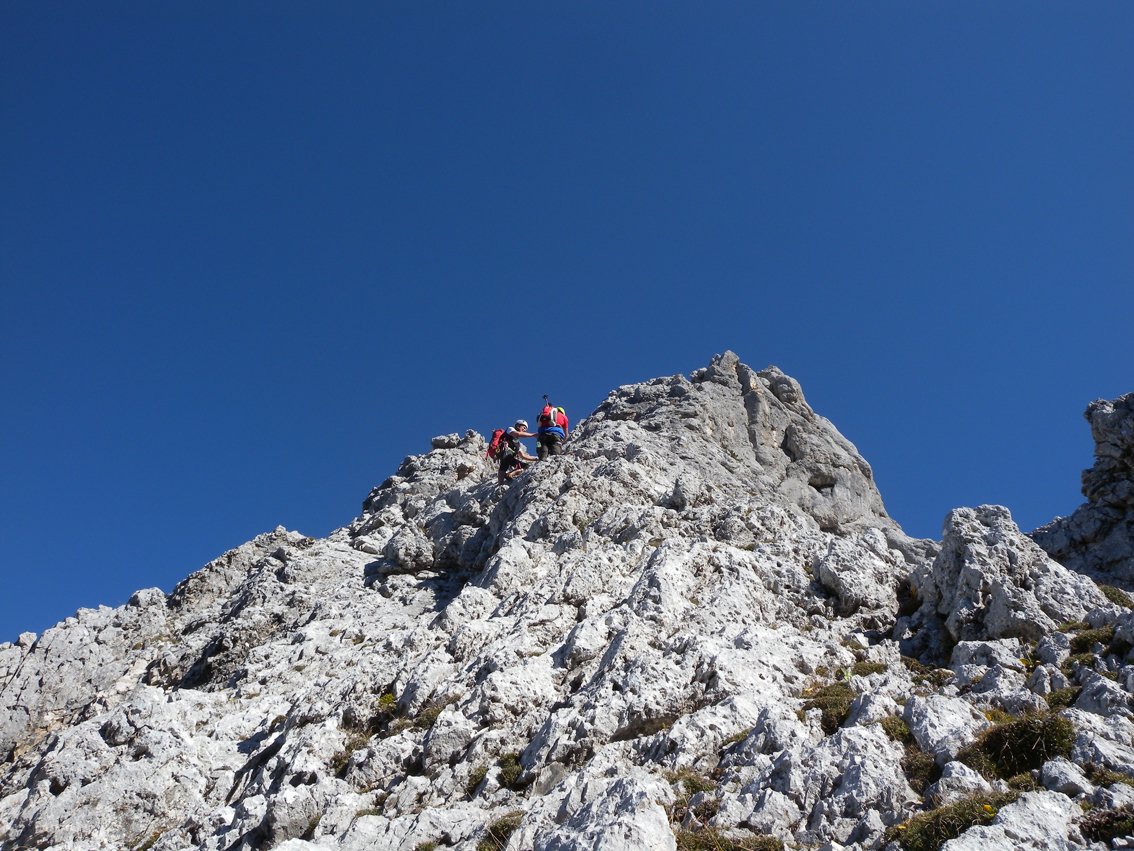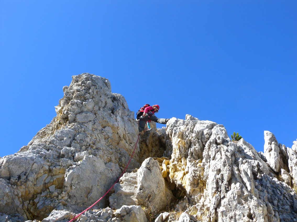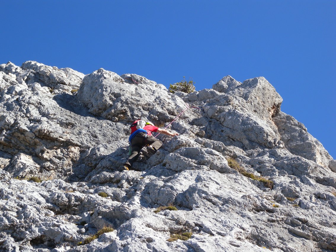 Abkletterpassage (siehe Übersichtsbild): Vom Gipfel folgt man dem Grat bis zu einem Abbruch (steile Rinne). Entweder direkt durch die Rinne hinunter, ober von oben gesehen rechts davon abklettern (beides 2). Unten dann von oben gesehen nach links die Felsstufe verlassen (es stecken div. Normalhaken und vereinzelt auch BH), man bleibt am besten angeseilt und lässt den Helm auf.