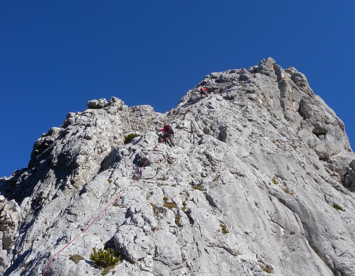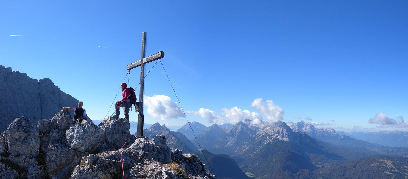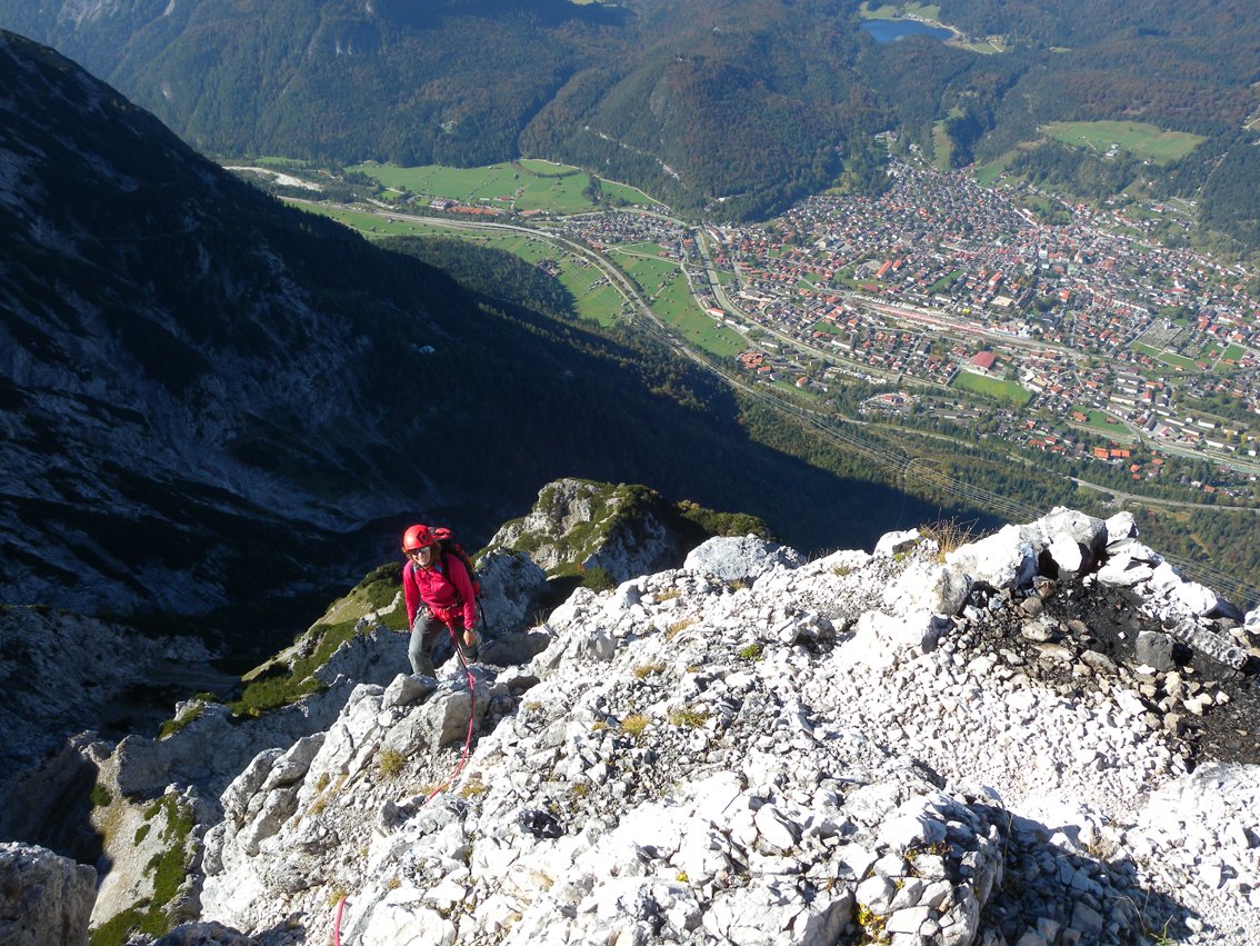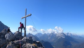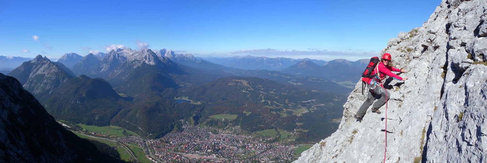 Sehr gute Abenteuertour an der Westseite des Karwendels! Das Klettern am Seil beschränkt sich auf 4 Seillängen, davor muss aber der spannende Zustieg bewältigt werden. Zustiegskletterstellen bis zum 2ten Grad, die wilde Umgebung bis zum soliden Einstiegshaken und der kurze aber alpine Abstieg machen diese Tour zum beliebten Ziel bei Mittenwald!