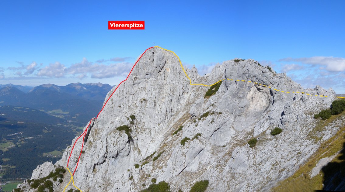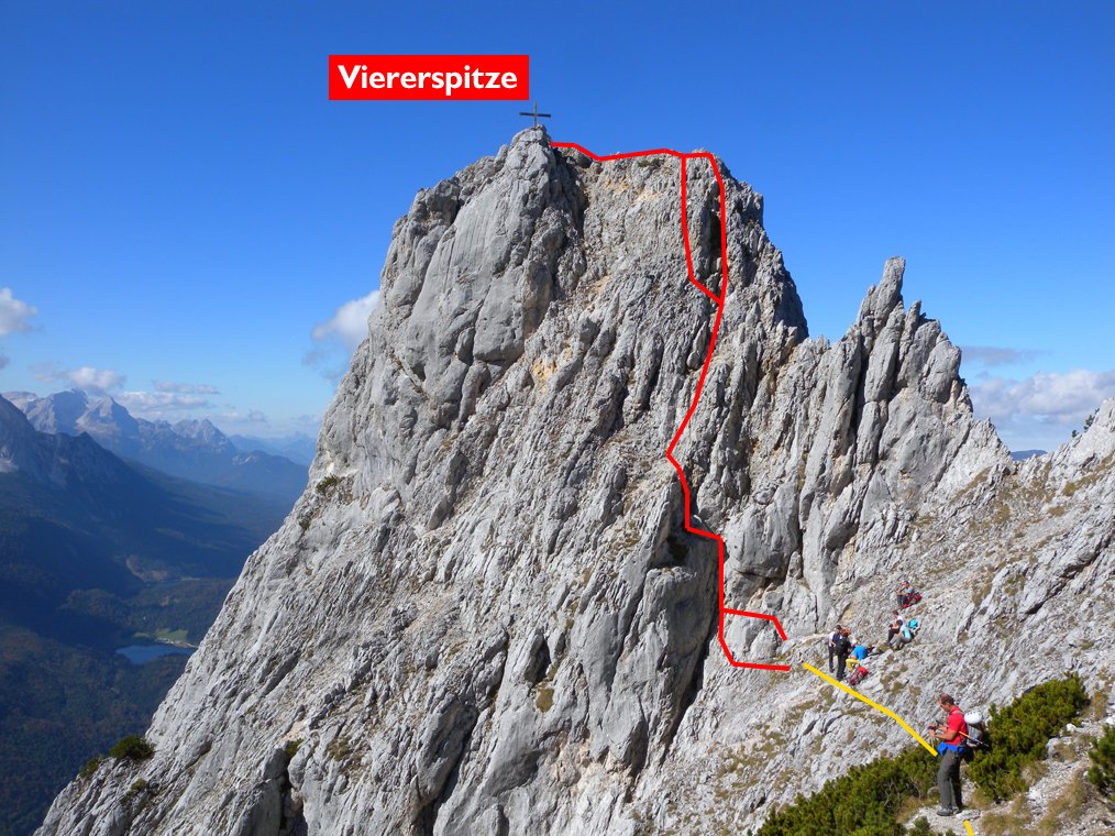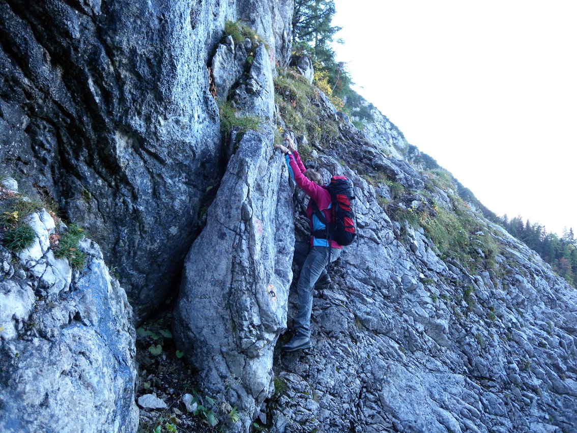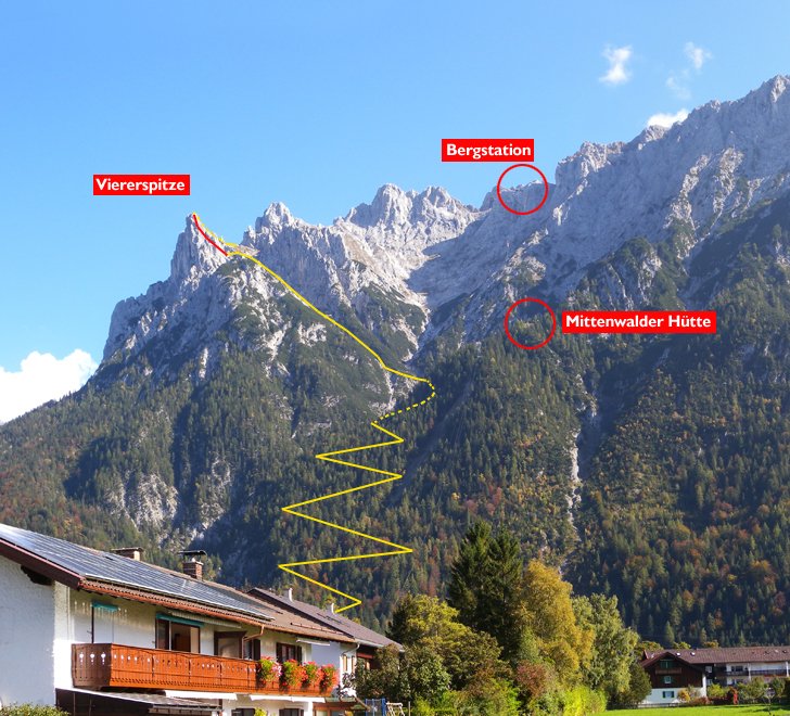 Sehr gute Abenteuertour an der Westseite des Karwendels! Das Klettern am Seil beschränkt sich auf 4 Seillängen, davor muss aber der spannende Zustieg bewältigt werden. Zustiegskletterstellen bis zum 2ten Grad, die wilde Umgebung bis zum soliden Einstiegshaken und der kurze aber alpine Abstieg machen diese Tour zum beliebten Ziel bei Mittenwald!