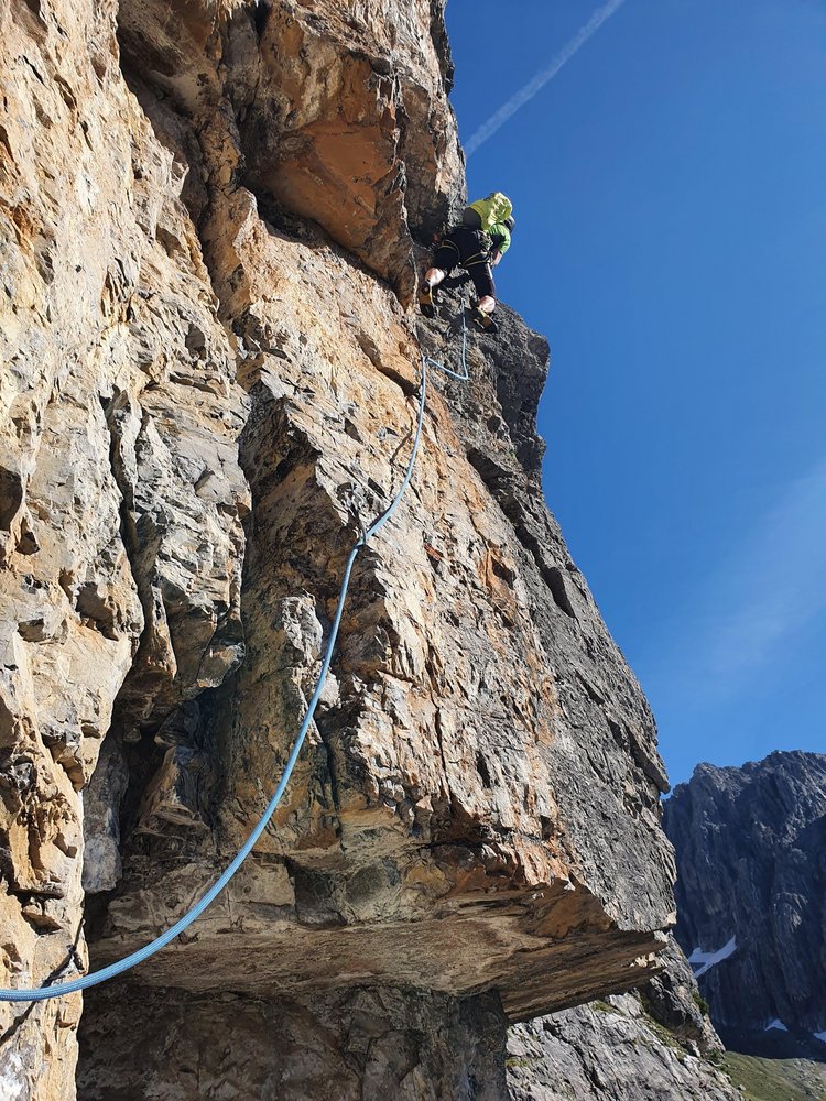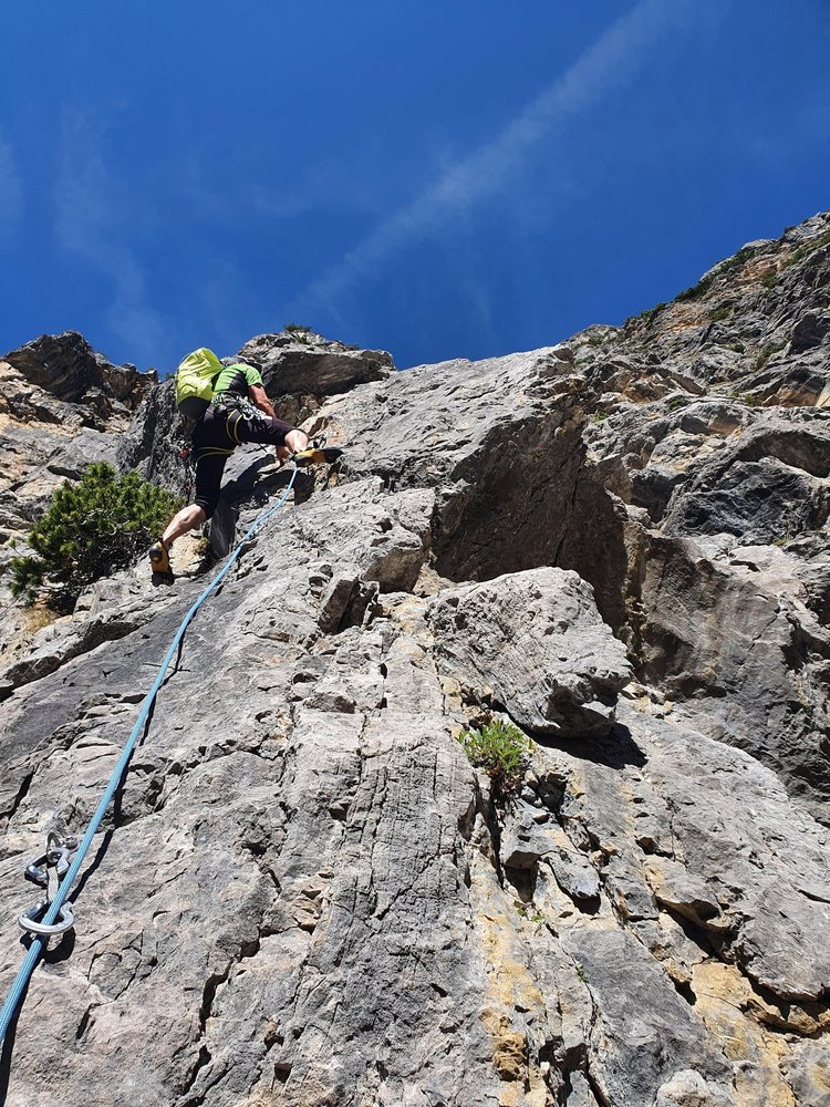 Steile begeisternde Wand- u. Überhangkletterei im gut griffigen Hauptdolomit. Der Charakter der Route läßt sich als „gut eingebohrte Alpine Sportkletter-Route“ beschreiben. Für sportliche Kletterer bietet die Variante „Sport“ das Tüpfchen auf das „i“ - gesamt eine aussichtsreiche Alpinkletter-Rundtour.