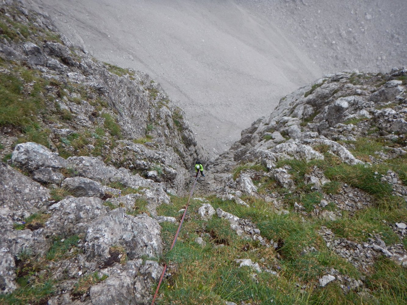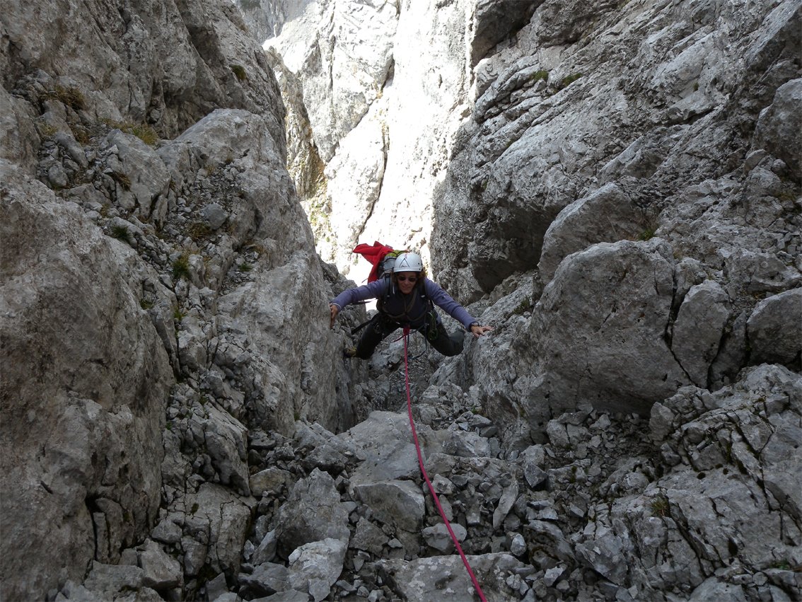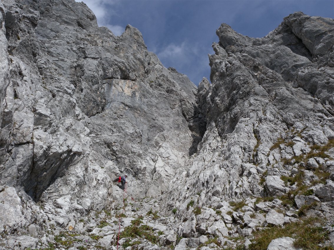 Denkt nicht nur an euere Sicherheit, sondern auch an die der anderen Alpinisten. Achtet vor allem vor und auf der leichten Rampe und auch im Mittelteil darauf, keine Steine loszutreten, wenn andere unter euch klettern. Den dritten Grad sollte man solide klettern können. Der Abstieg ist bei Nässe und Schnee heikel und erfordert nochmals vollste Aufmerksamkeit.