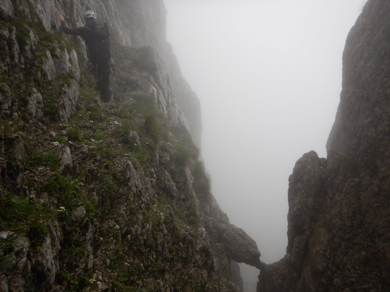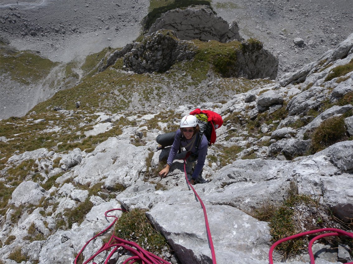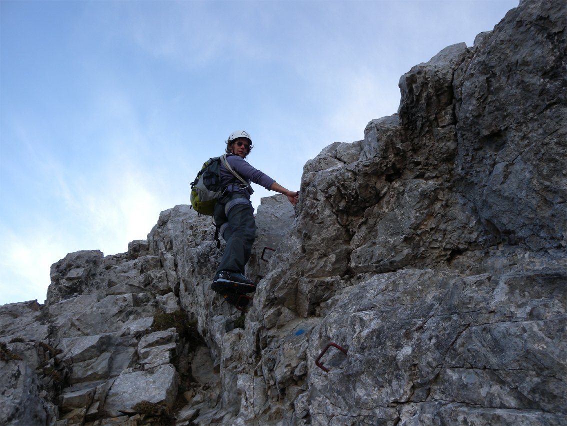 Denkt nicht nur an euere Sicherheit, sondern auch an die der anderen Alpinisten. Achtet vor allem vor und auf der leichten Rampe und auch im Mittelteil darauf, keine Steine loszutreten, wenn andere unter euch klettern. Den dritten Grad sollte man solide klettern können. Der Abstieg ist bei Nässe und Schnee heikel und erfordert nochmals vollste Aufmerksamkeit.