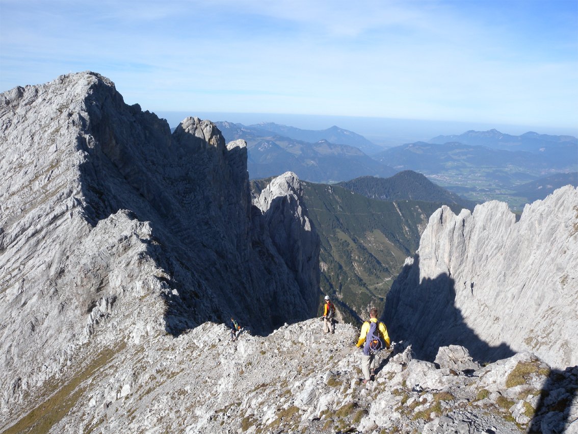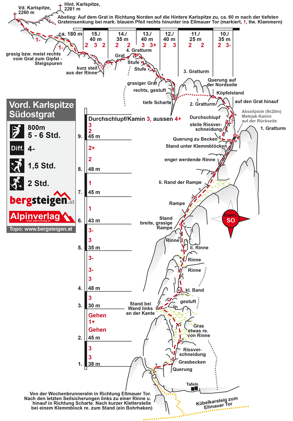 Schöner, leichter Klassiker über den Südostgrat auf den Gipfel der Vorderen Karlspitze. Die Vordere Karlspitze liegt links des berühmten Ellmauer Tors, einer mächtigen Einsattelung direkt auf dem Hauptkamm des Wilden Kaisers. Der lange Anstieg verläuft unten durch eine Wandzone auf eine große Rampe, an deren Ende die Rissverschneidung mit Durchschlupf (es geht aber auch außen, ist dann 4+) wartet. Danach folgt man dem Grat (eine Stelle 3+, mit 2 BH gesichert) bis zum Gipfel. Die Tour wurde von Herbert Haselsberger mit einigen Bohrhaken saniert, der alpine Charakter des Anstieges blieb aber erhalten. Die Wegfindung ist dank der recht gut sichtbaren Bohrhaken etwas einfacher geworden.