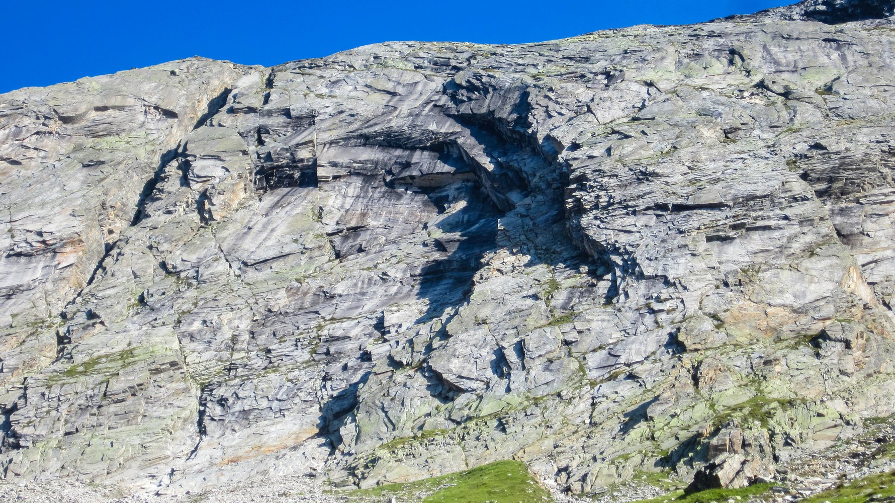 Sobald man an der Kreuzung des Weges mit dem Höhenweg angelangt ist, sieht man den Einstieg bereits, von hier aus über Schutt bis unter die Wand zum Einstieg.