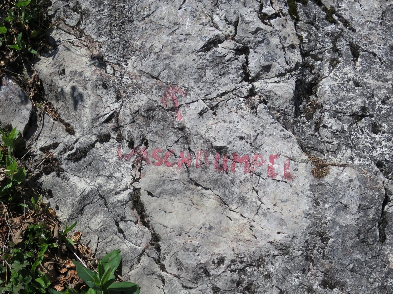 Vom Parkplatz der Roten Wand auf Forststraße in Richtung Buchebensattel, in der ersten Kehre auf gut sichtbaren Steigspuren nach rechts aufwärts bis zum Rucksackplatzl (Stein mit Holzbrett oder Nägel in der Wand). Von dort folgt dem Weg rd. 50 Meter nach rechts und steigt dann links auf Wegspur zum Einstieg auf (recht darunter ein markanter Nadelbaum). Am Einstieg steht in rot "Waschrumpel".