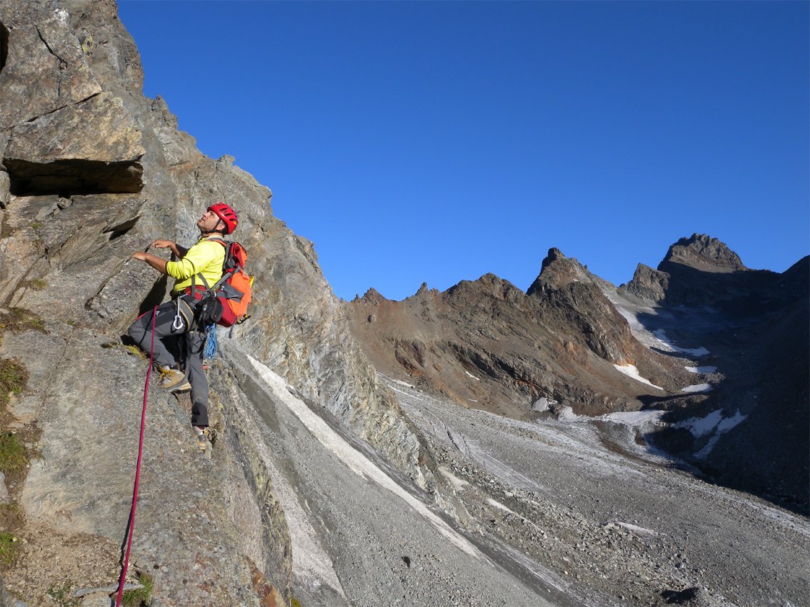 Am besten mit dem Hüttenwirt am Vorabend die Verhältnisse abklären. In der Regel wird auf dem Ostgrat (also über den Aufstiegsweg) wieder abgestiegen und über schwere Stellen abseilen (am sichersten). Die leichten Seillängen klettert man ab, die schwereren Stufen seilt man ab, siehe Toposkizze (das Topo wurde 2023 ergänzt).
