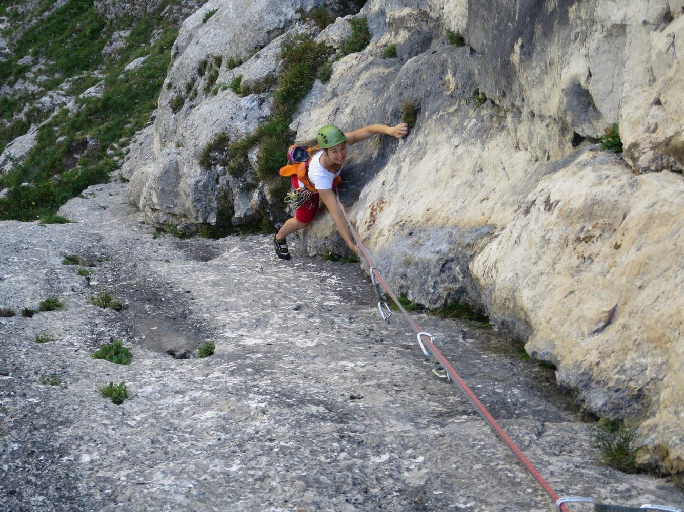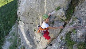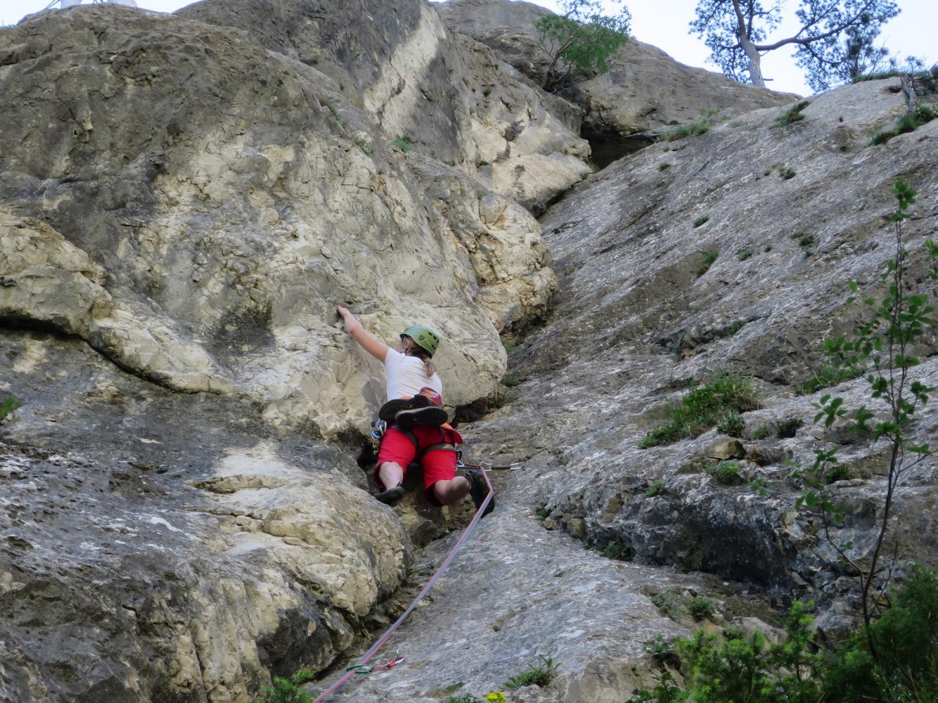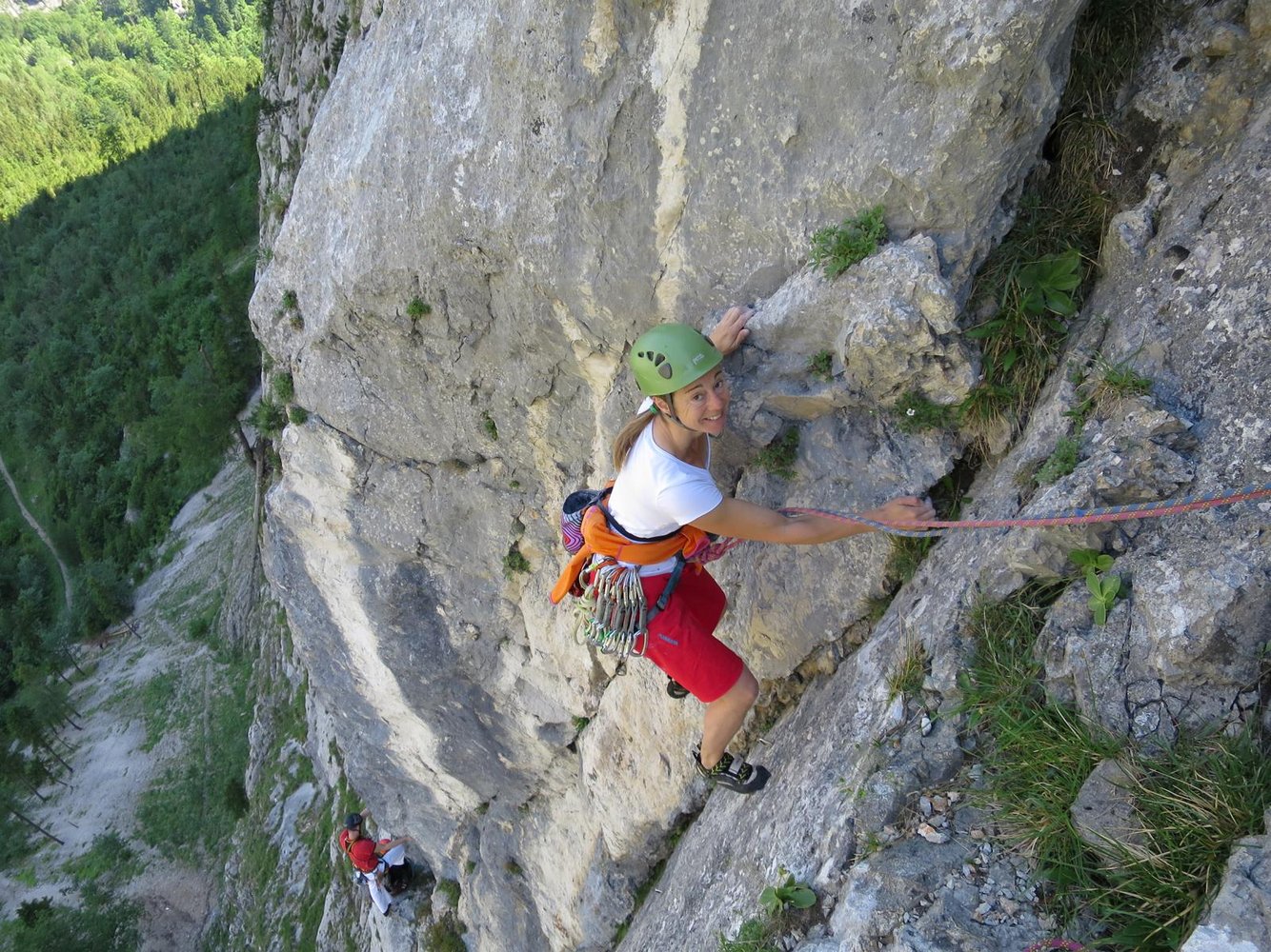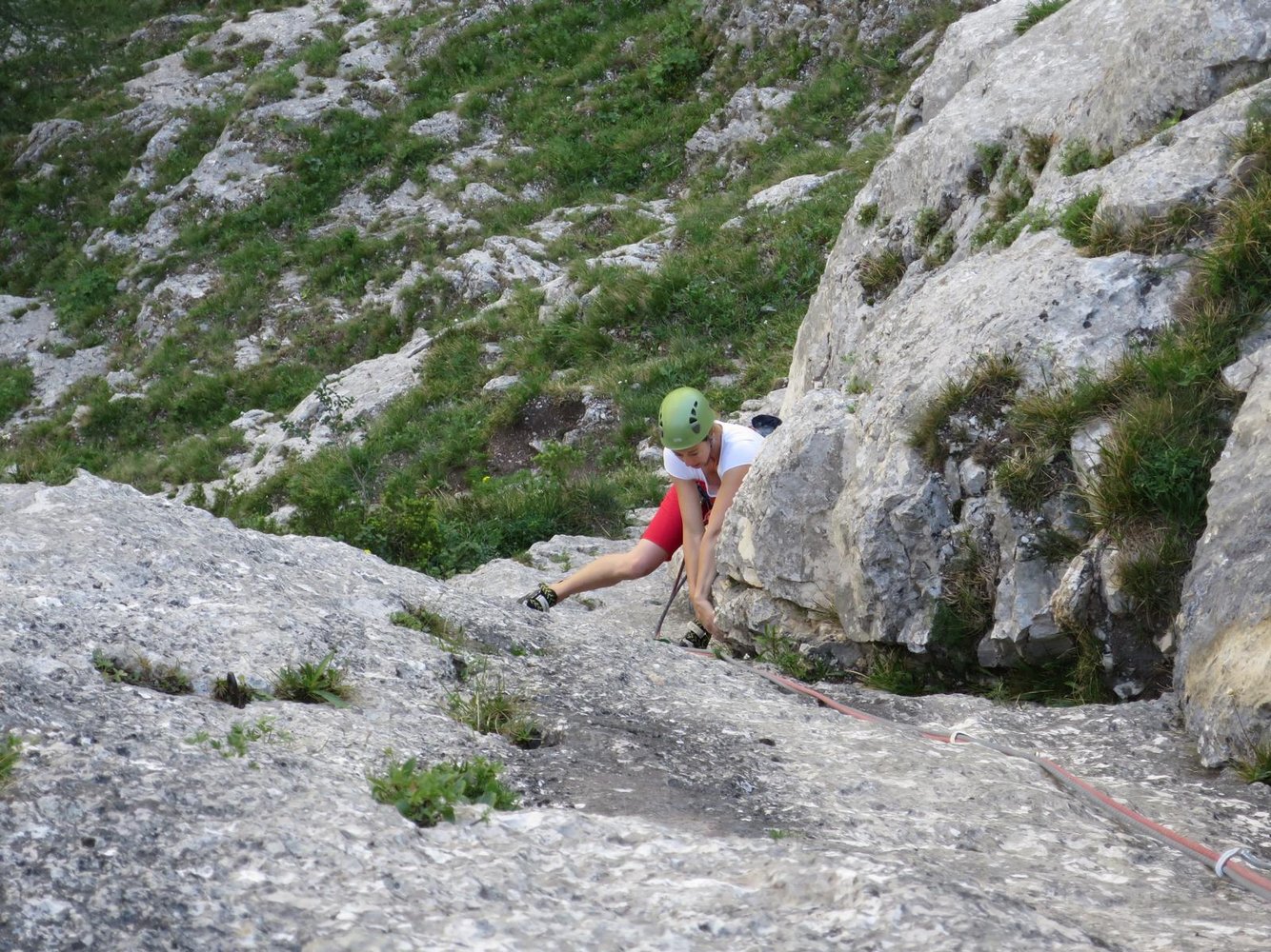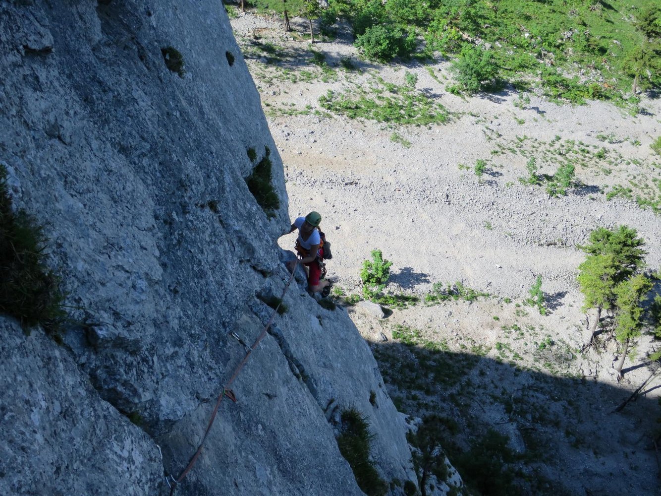 Einfachseil, 12 Expreßschlingen, Helm und lange Bandschlingen.