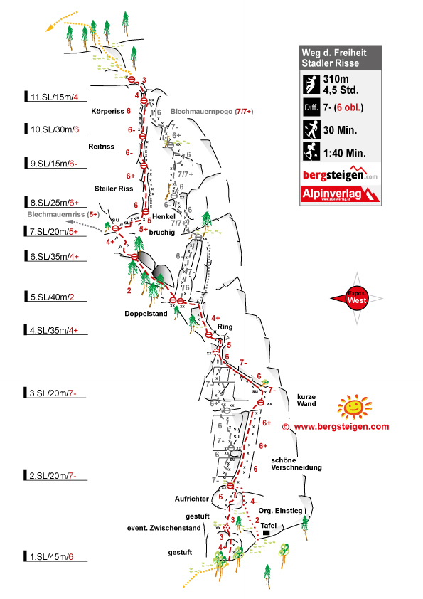 Kombination von zwei Klassischen Blechmauern Kletterrouten, die nachträglich gut mit Bohrhaken saniert wurde. Die Kletterrei bietet durchaus anstrengende Riss- und Verschneidungskletterei und hat trotz der uppigen Sanierung einen Alpinen Touch.