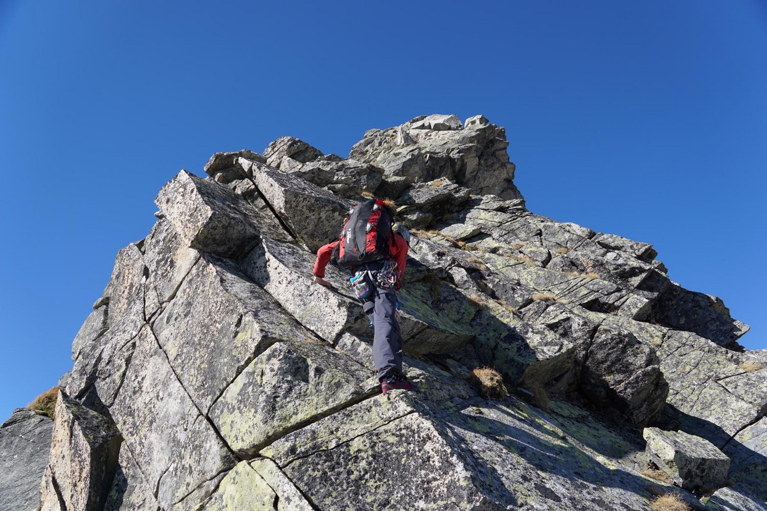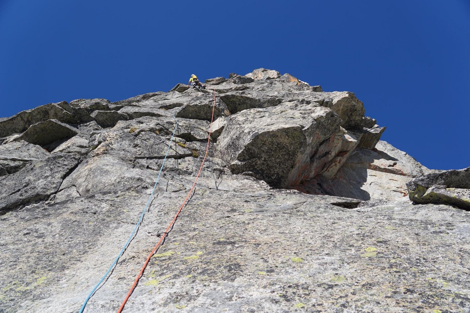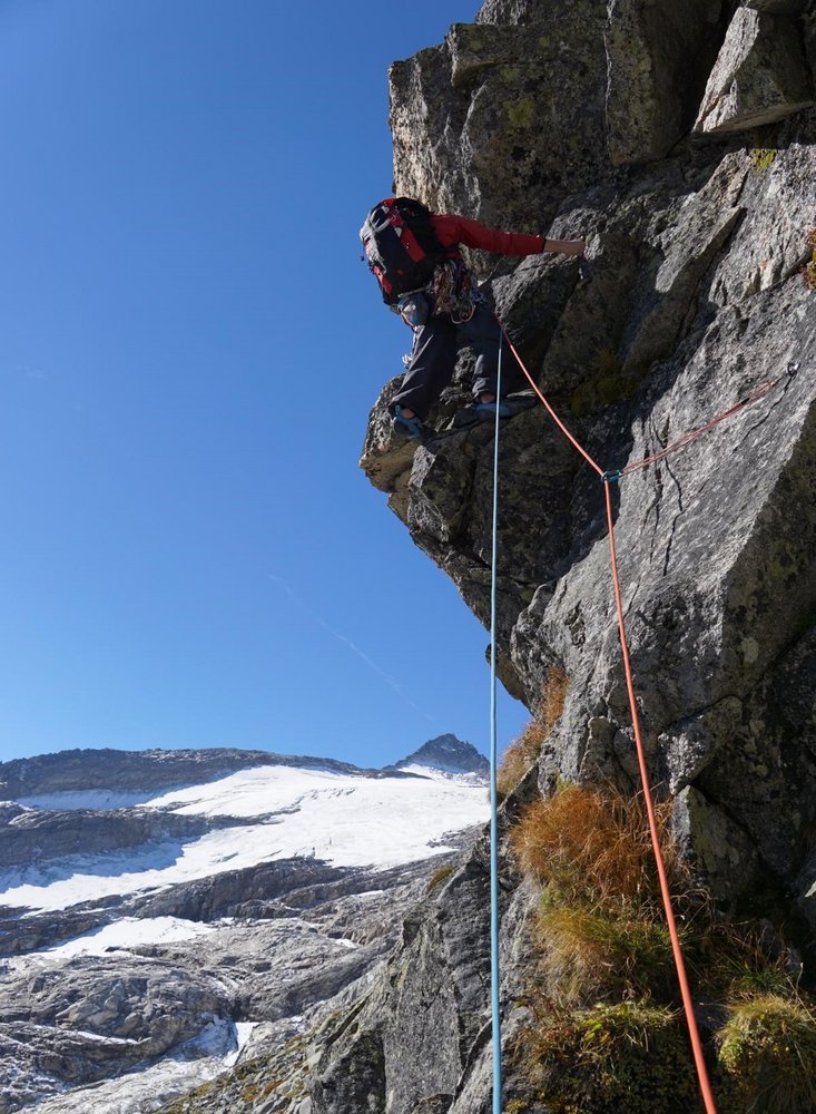 Nach der letzten Seillänge folgt man dem Grat bis zu einem Aufschwung. Dort seilt man sich über eine der Südwandrouten mehrere Seillängen ab. Alternativ kann man auch über den Gipfel zum Normalweg absteigen.
