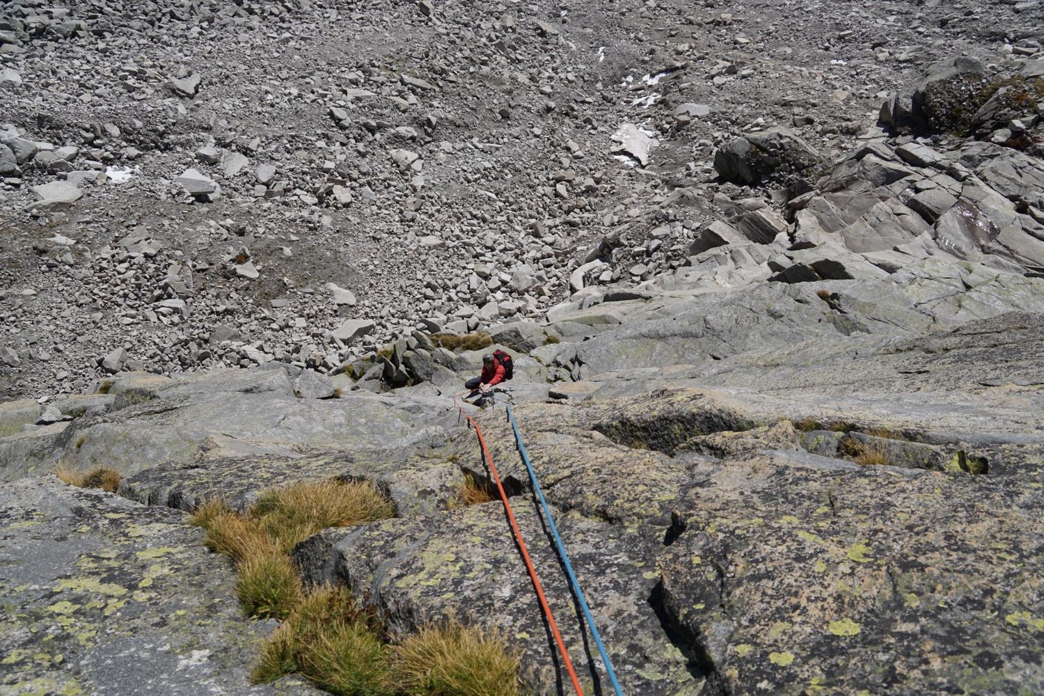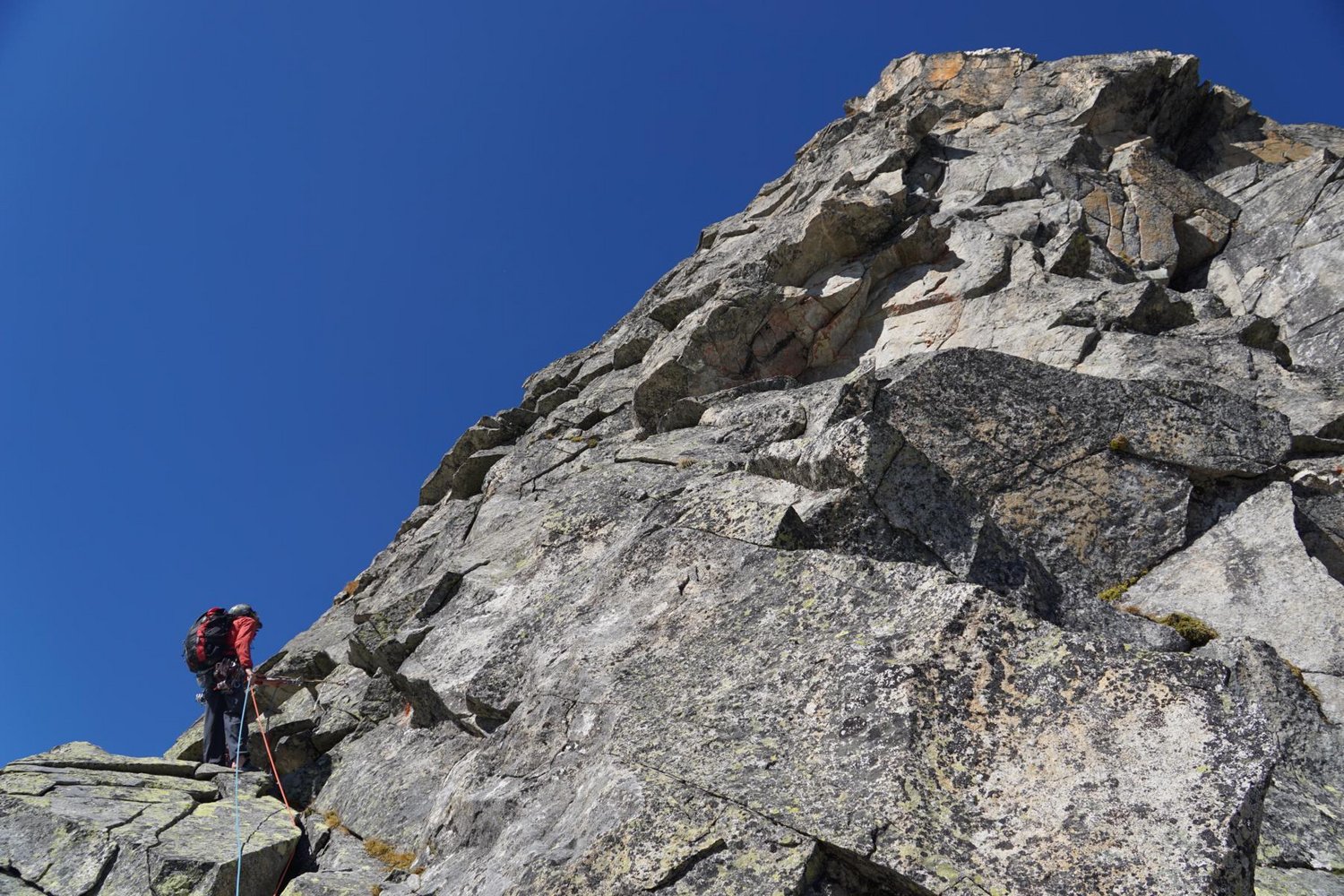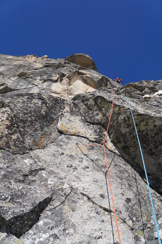 Lässige Klettertour in alpiner Umgebung! Die Route wurde mit Bohrhaken saniert, Stände und schwere Stellen wurden damit entschärft. Ein Satz mobiler Sicherungsgeräte rundet das Sicherheitsgefühl endgültig ab. Die Route bietet festen, schön zu kletternden Gneis, hauptsächlich an Platten und Verschneidungen. Und wer nach der Tour noch nicht genug hat, kann eine der zahlreichen Touren an der Südwand noch anhängen.