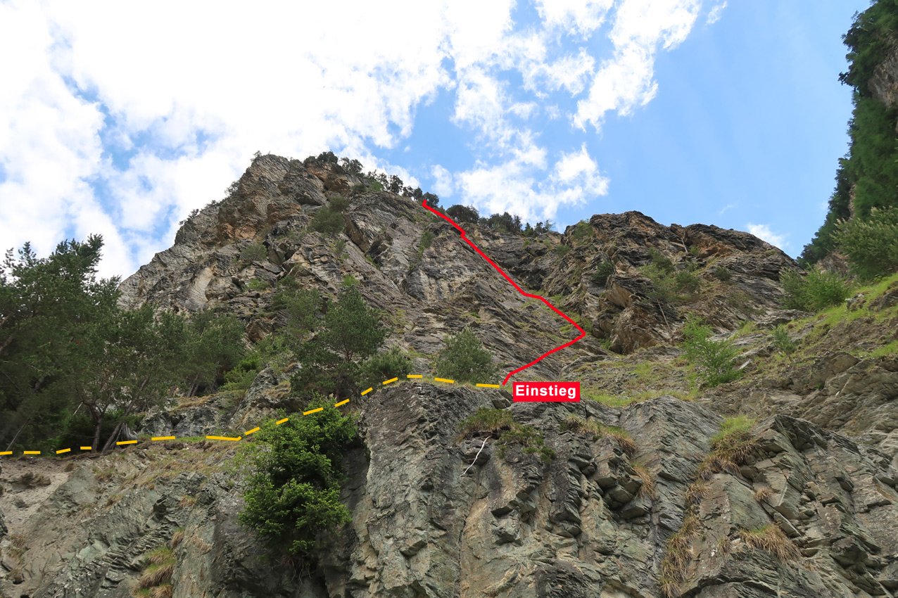 Von der Festung Nauders auf der Straße durch den ersten Tunnel in Richtung Kajetanbrücke/Inn. Im Tunnel geht man besser auf der rechten Seite (Gehsteig). Nach dem Tunnel quert man die Straße und geht vor dem nächsten Tunnel links auf der alten Passstraße weiter. Man kommt durch zwei Tunnel (im ersten befindet sich ein Mixed-Eisklettertraining-Parcour), gleich nach dem zweiten Tunnel sieht man oben die Wand mit der Route. Noch ein paar Meter der Straße entlang und bei Pfadspuren (Steinmann) etwas im Wald aufwärts, dann leicht ausgesetzt nach rechts in ein steiles Steinfeld queren und hinauf zum Einstieg bei Bohrhaken.