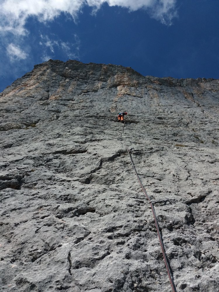 1. Empfohlen: Über die Wand abseilen (1 x ca. 60m), problemlos zum 1. Stand.
